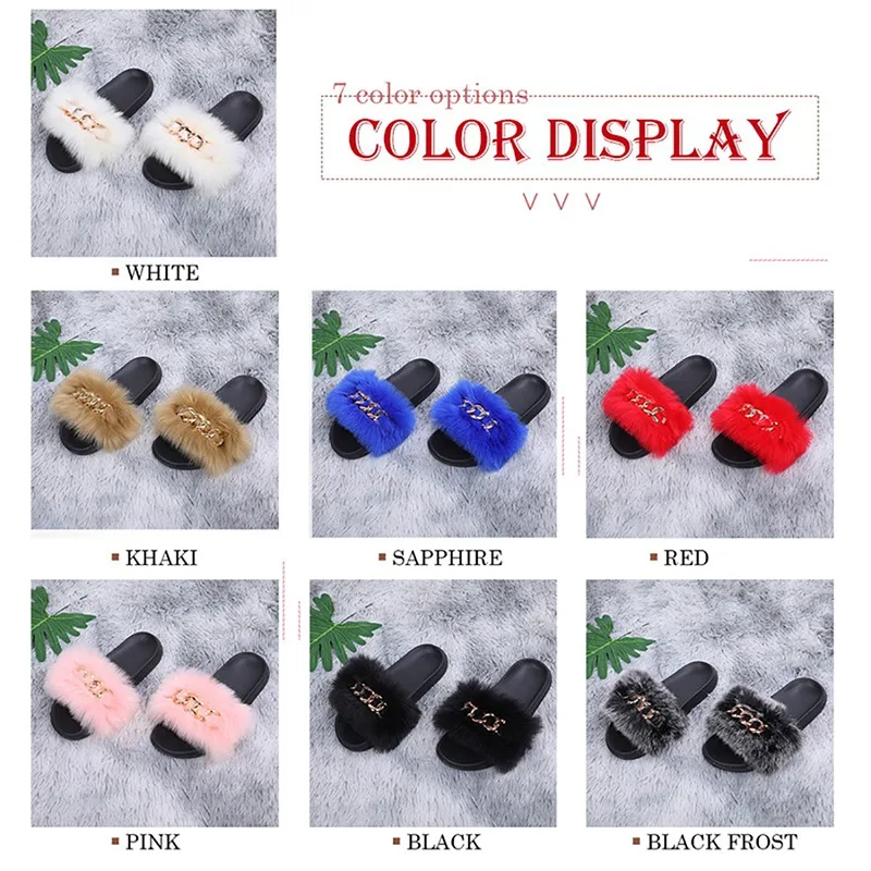 Меховые сланцы, плюшевые шлепанцы, модные шлепанцы с цепочкой, однотонные искусственные шлепанцы, женские повседневные шлепанцы без застежки на плоской подошве, женская обувь