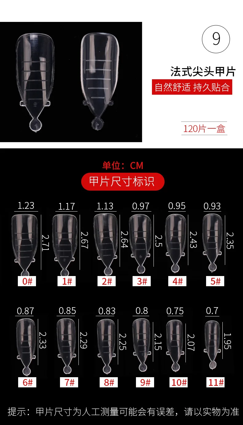 Материал: высококачественный АБС-пластикКоличество: 120 штЦвет: прозрачныйРазмер: 10 разных размеров, размер s, как показано на рисункеПосылка: в общей сложности 120 штук каждого размера 12 шт., 4 # и 5 # являются наиболее часто используемыми, а больше дизайнов-4,5 # и 5,5 # в двух размерахКак использовать:1. Слегка отшлифуйте поверхность ногтя.2. Нанесите очень тонкий слой базового покрытия и высушите его под УФ/светодиодной лампой.3. Выберите накладной ноготь подходящей формы и размера.4. Нанесите строительный гель на форму для ногтей, используйте ручку для дизайна ногтей с очищающим средством, чтобы гель был гладким.5. Приклейте его к вашему настоящему ногтю и убедитесь, что он полностью прилегает, и высушите его под УФ/светодиодной лампой.6. Снимите накладной ноготь, обрежьте форму и отполируйте ногти.7. Нанесите верхний слой и высушите его под УФ/светодиодной лампой.8. Создайте свой ноготь с помощью узоров, которые вам понравятся.