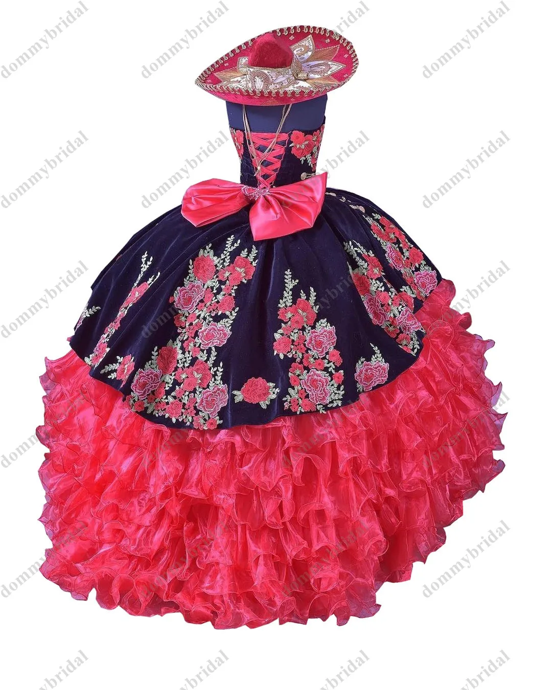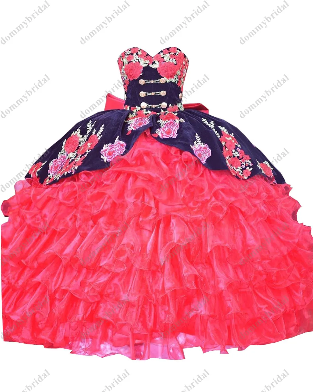 Модное бальное платье из черной бархатной красной органзы, милое платье для Quinceanera, пышные платья с оборками и объемным цветочным рисунком, 2022, с большими бантами XV