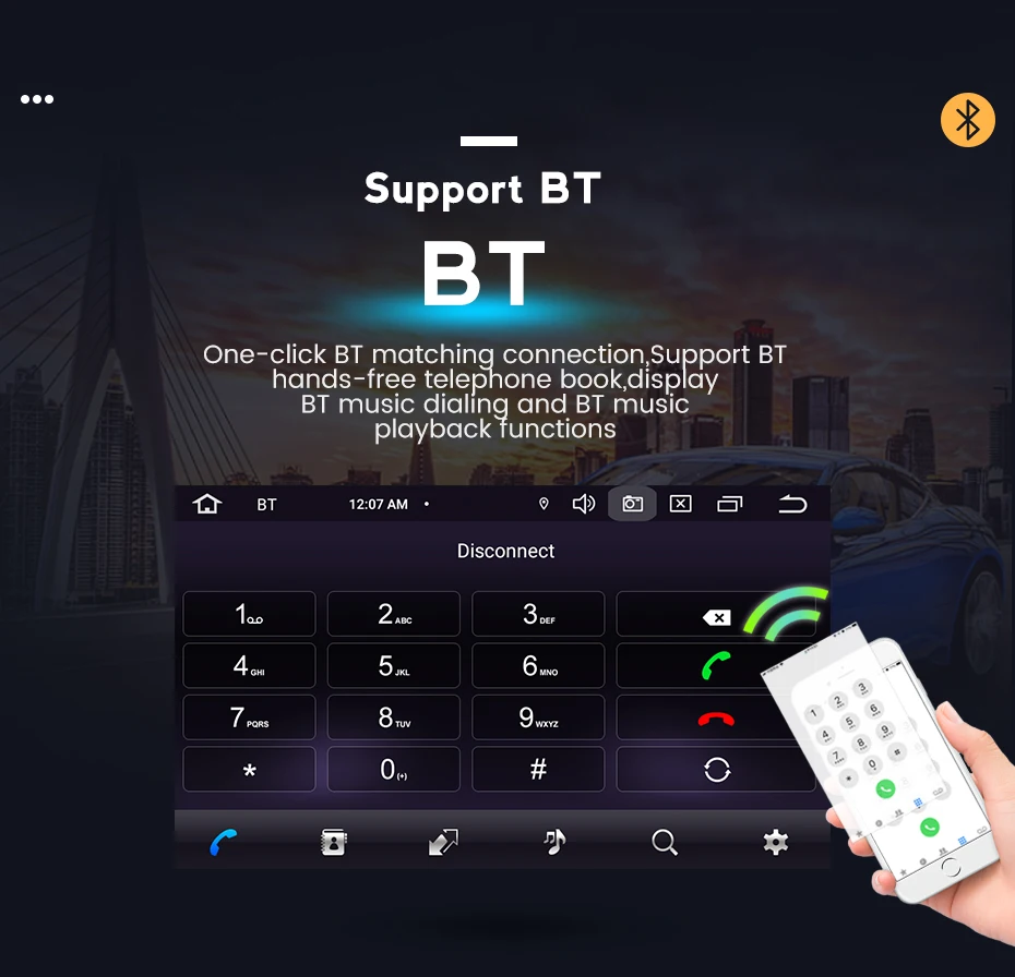 Встроенный Bluetooth и Wi-Fi, поддержка громкой связи и воспроизведения музыки по Bluetooth, встроенный Google map, встроенный Carplay + Android Auto, Встроенный RDS, DSP