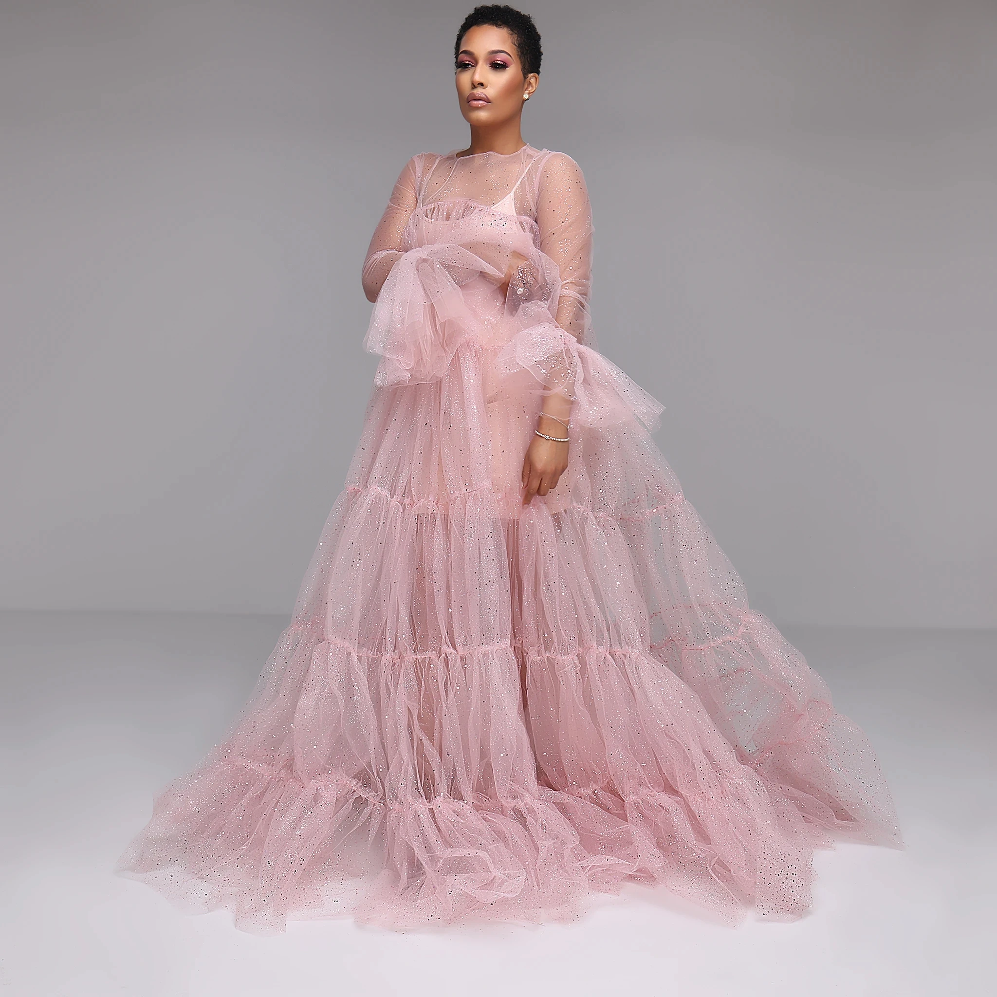 Женское Тюлевое платье для беременных, длинное ТРАПЕЦИЕВИДНОЕ ПЛАТЬЕ розового цвета с широким рукавом, для фотосессии