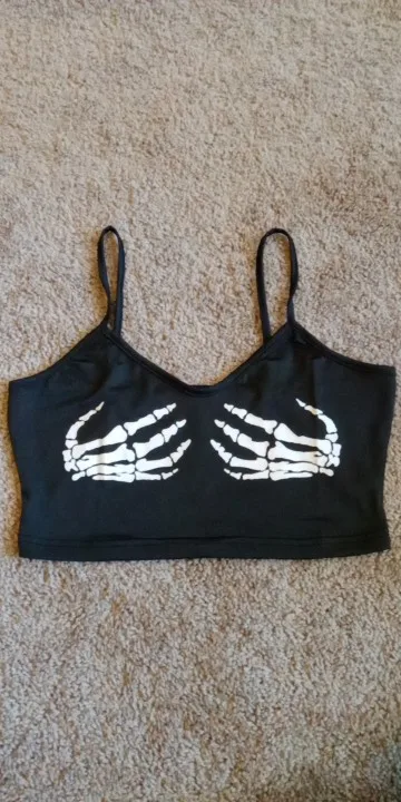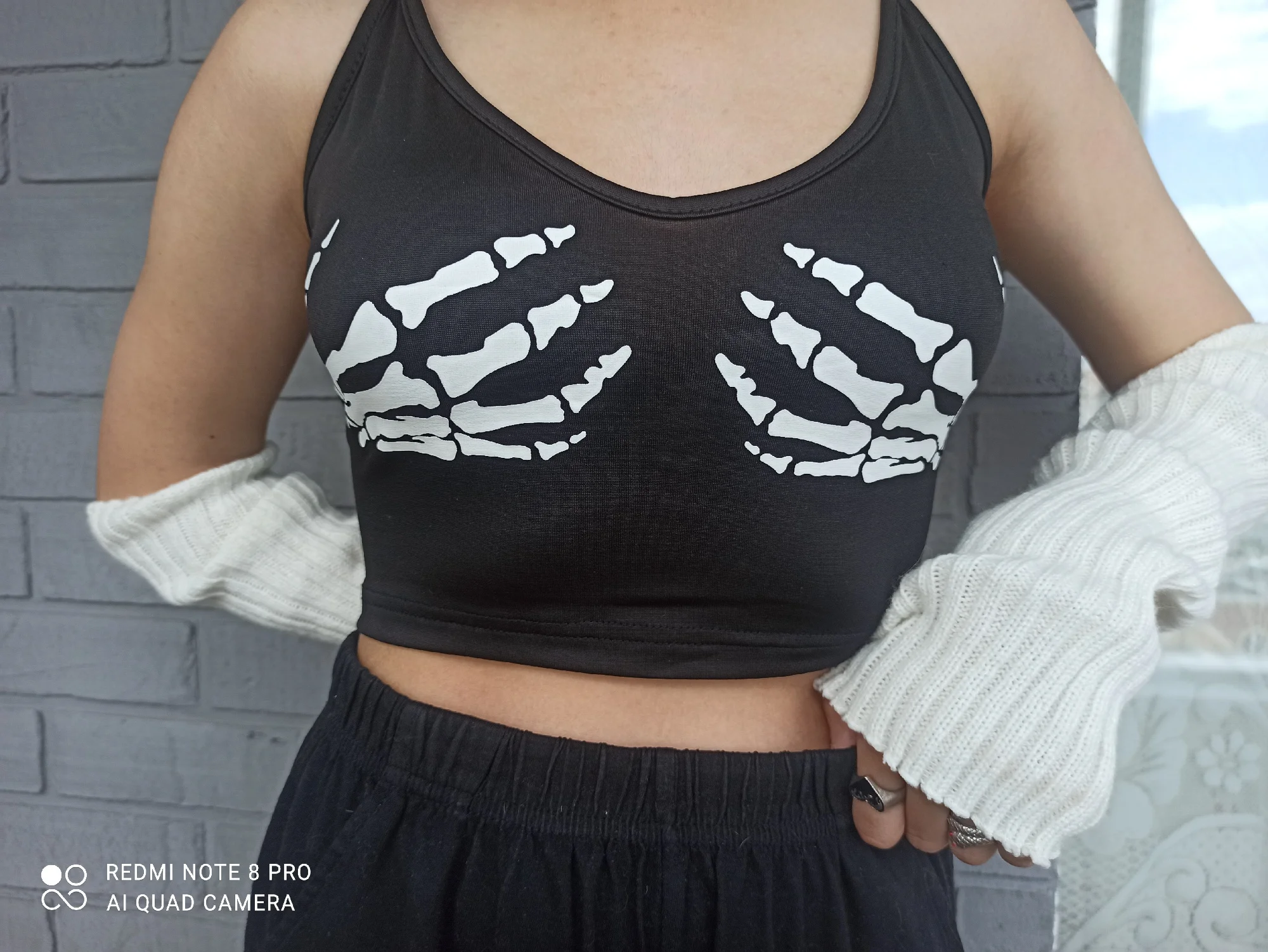 Женский облегающий Топ без рукавов, готический короткий топ с принтом скелета, с V-образным вырезом, из спандекса, на бретелях-спагетти, Клубная одежда в стиле Харадзюку