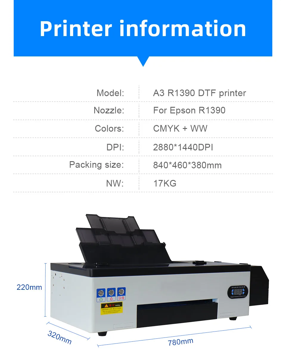 Принтер A3 R1390 1 штA3 прозрачная пленка из ПЭТ 100 штПорошок горячего расплава 1 кгТекстильные пигментные чернила 4*100 млТекстильные пигментные чернила белый 2*100 млПрограммное обеспечение AcroRIP 9,0 1 шт.