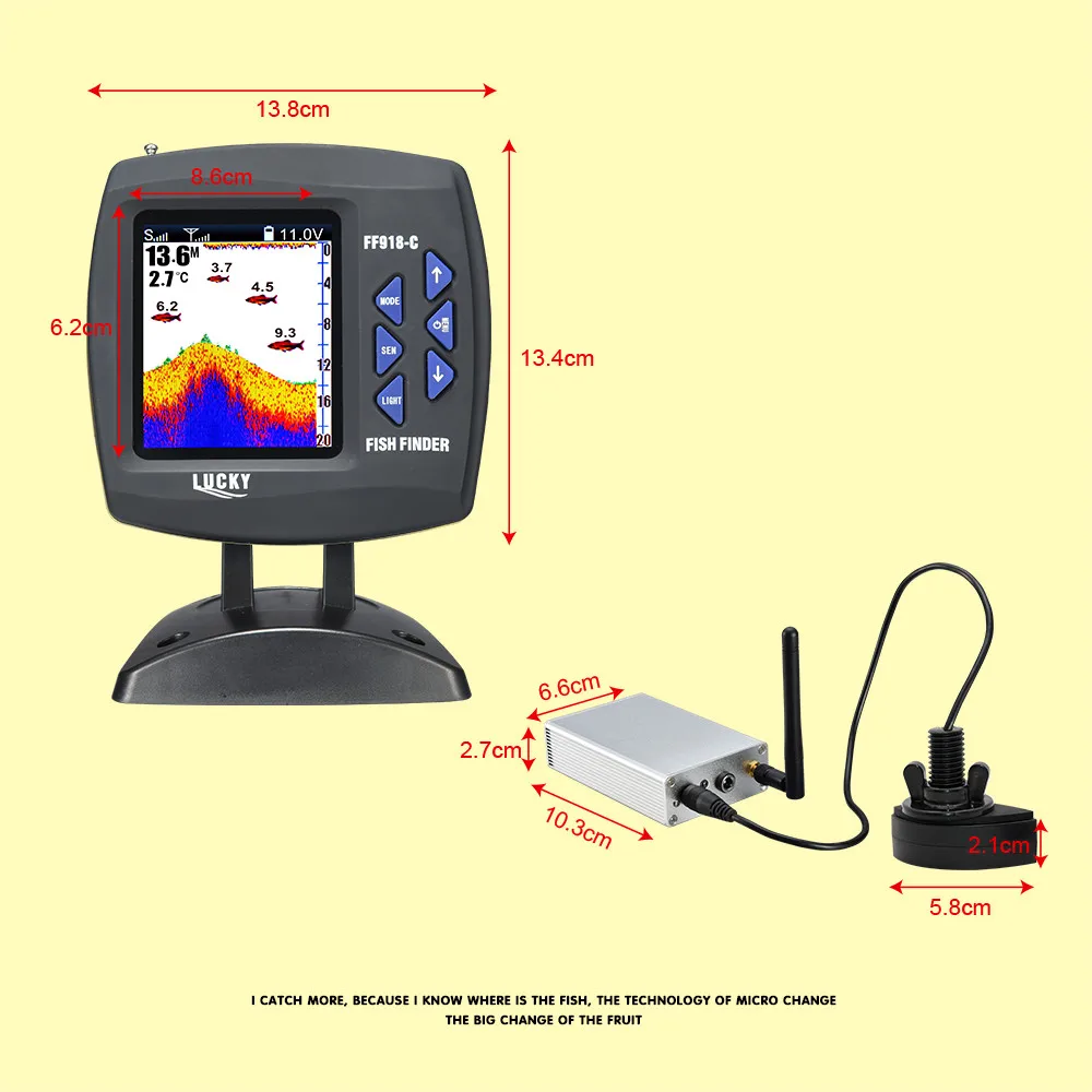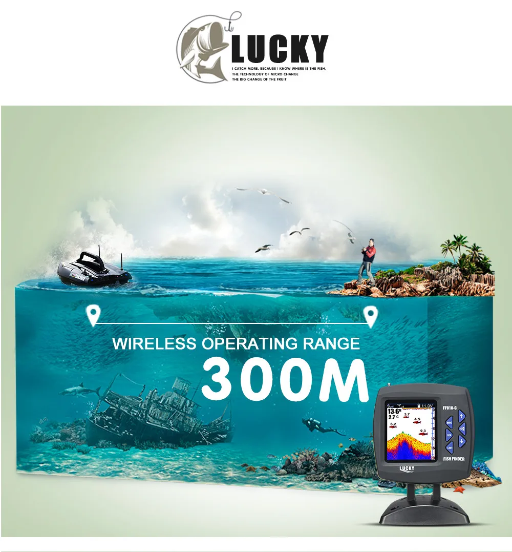 FF918-CWLS 适用于一些通用诱饵船:Carplounge/водные/Vegaboat/карп/Анаконда/Anatec 双体船等. 幸运鱼探仪不包括诱饵船天线.