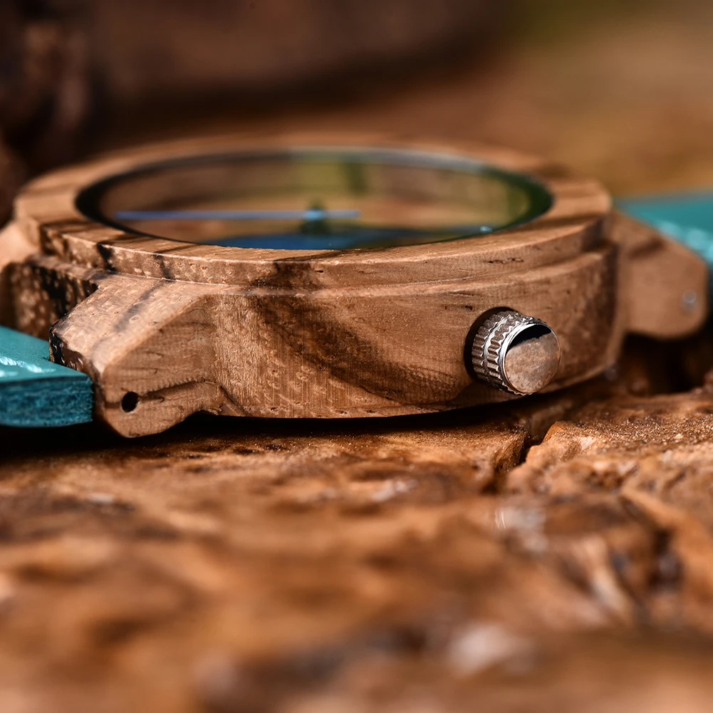 Ручная работа, выполненная из древесины туя, в сочетании с синей краской из смолы, циферблаты были полностью выполнены вручную.Каждая древесина уникальна, поэтому каждая модель часов будет немного отличаться по цвету и рисунку, и мы будем ждать.
