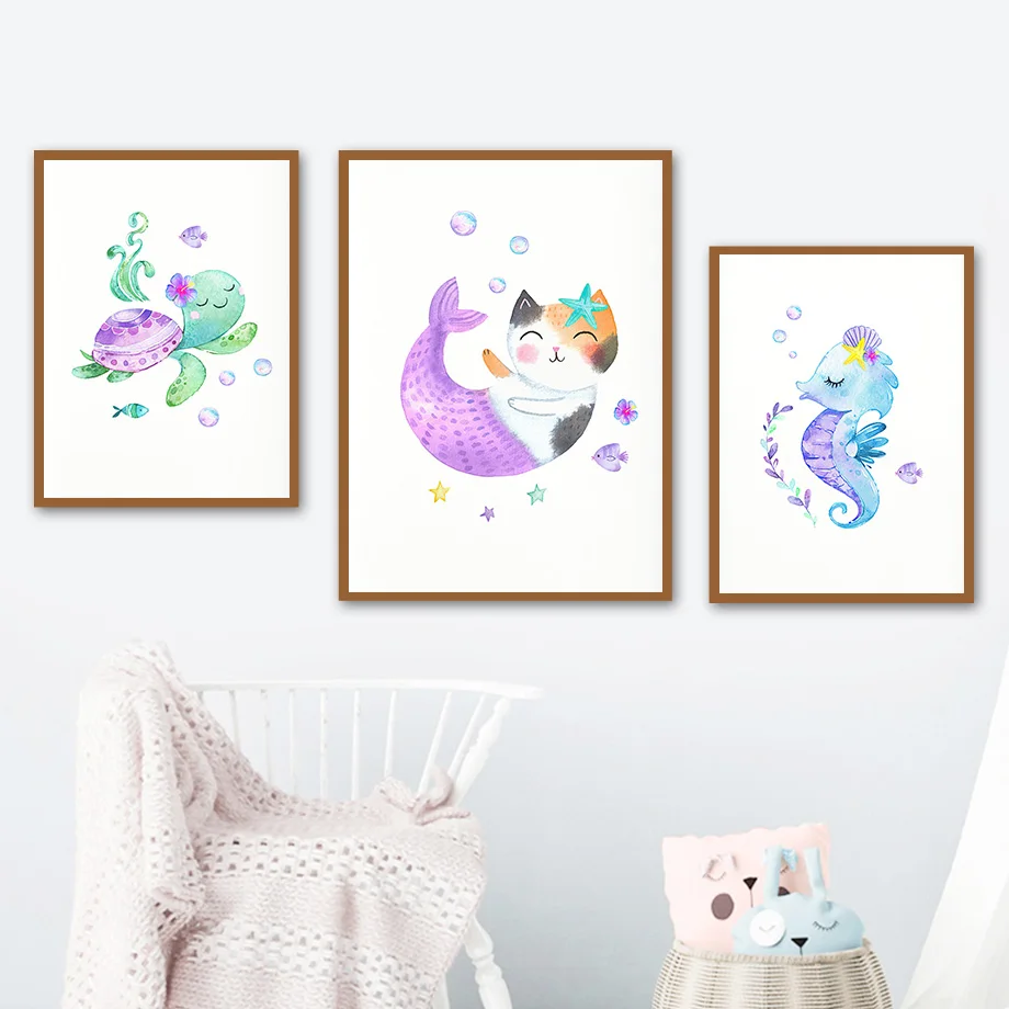 Настенная картина с изображением кота русалки, Кита, морской лошади, осьминога, черепахи, постеры и принты на холсте в скандинавском стиле, настенные картины, декор для детской комнаты