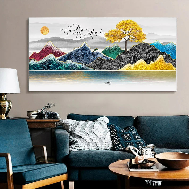 styleGold Tree Birds mountain Canvas Paintings for living room wall