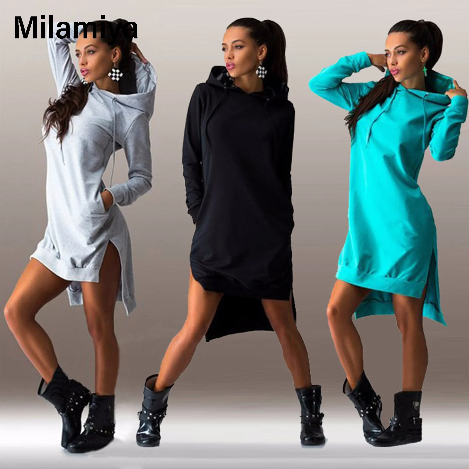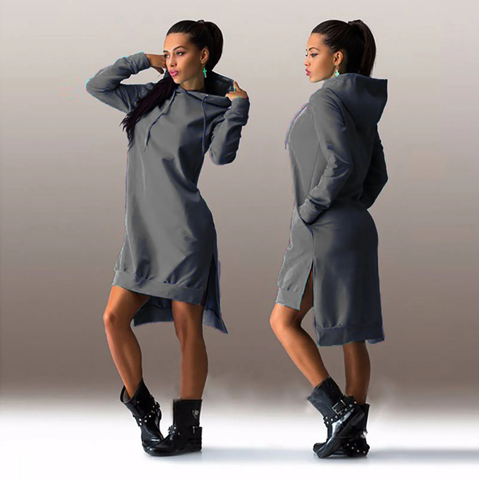 Модное неправильное однотонное повседневное Свободное платье с капюшоном и длинными рукавами, свитер