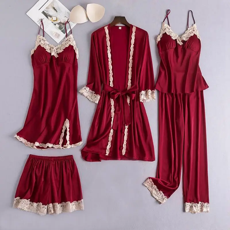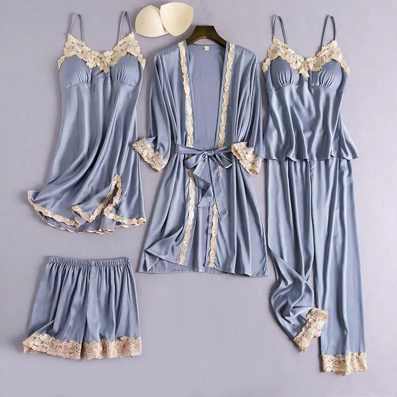 Комплект из 5 предметов, женский кружевной Атласный халат, ночная рубашка, пижама, кимоно, для весны, ночной купальный Халат