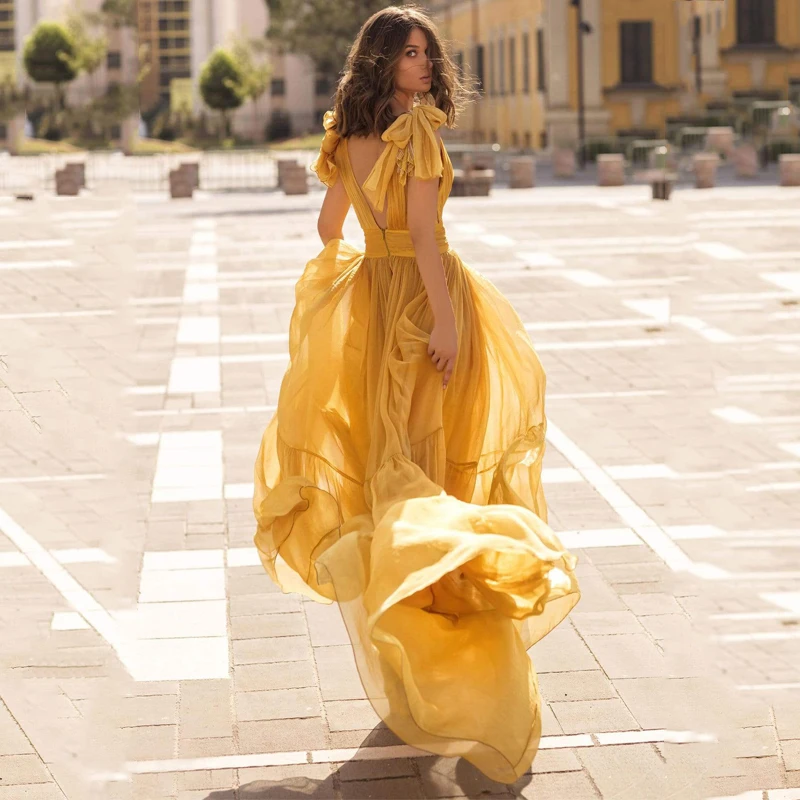 Thinyfull Желтый Белый Тюль платья для официальных мероприятий и сексуальные сексуальное нижнее белье с глубоким v-образным вырезом без рукавов платье с а-силуэтом и открытой спиной Вечерние платье для выпускного вечера длинное платье изготовление размеров под заказ