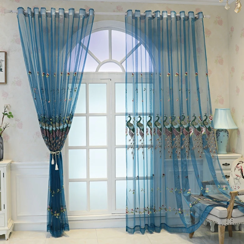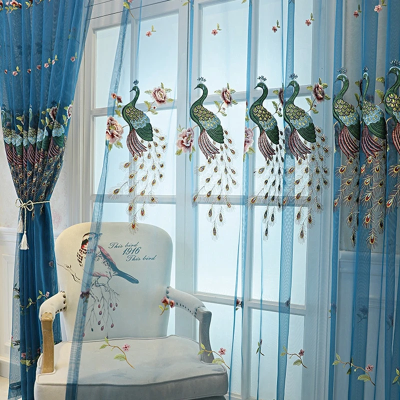 Тюлевые шторы с вышивкой синего павлина для гостиной, роскошные изысканные прозрачные шторы из вуали, стеклянная дверь в кухню шторы, занавески #5