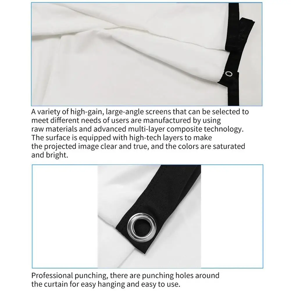 Особенности:1. Полупрозрачный полиэфирный материал используется для передняя и задняя проекция.2. С помощью двустороннего скотча и крючка проекционный экран можно легко установить на стену или снять с нее.3. Экран равномерно распределяет светильник, и вы ощутите идеальное визуальное удовольствие от лучшего изображения и цветопередачи.4. Проекционный экран подходит для многих случаев и является отличным выбором для фильмов на открытом воздухе, фильмов в домашнем кинотеатре, учебных классов, презентаций в конференц-залах, публичных дисплеев и т. д. Его можно сложить как можно меньше и не занимает места, что удобно для переноски.5. Четырехсторонняя черная кайма может улучшить контрастность изображения. Кроме того, экран универсально совместим с большинством светодиодных, ЖК-или DLP проекторов на рынке.Технические характеристики (около):Материал: полиэстерФормат экрана: 16:9Основной цвет: белыйРазмер Черной Рамки: 3 см/1,18 дюймаРазмеры экрана:60 дюймов --- ширина 1,33 * высота 0,75 метра/52,36 * дюйма (4 * липкий крючок)72 дюйма --- ширина 1,59 * высота 0,90 метра/62,60 * дюйма (4 * крючок)84 дюйма --- ширина 1,86 * высота 1,05 метра/73,23 * дюйма (6 * крючок)100 дюйма --- ширина 2,20 * высота 1,24 метра/86,21 * дюйма (6 * крючок)120 дюйма --- ширина 2,65 * высота 1,49 метра/104,33 * дюйма (8 * крючок)150 дюйма --- ширина 3,32 * высота 1,87 метра/130,71 * дюйма (12 * липкий крючок)Упаковочный лист:1 * экран проектора1 * набор липких крючков