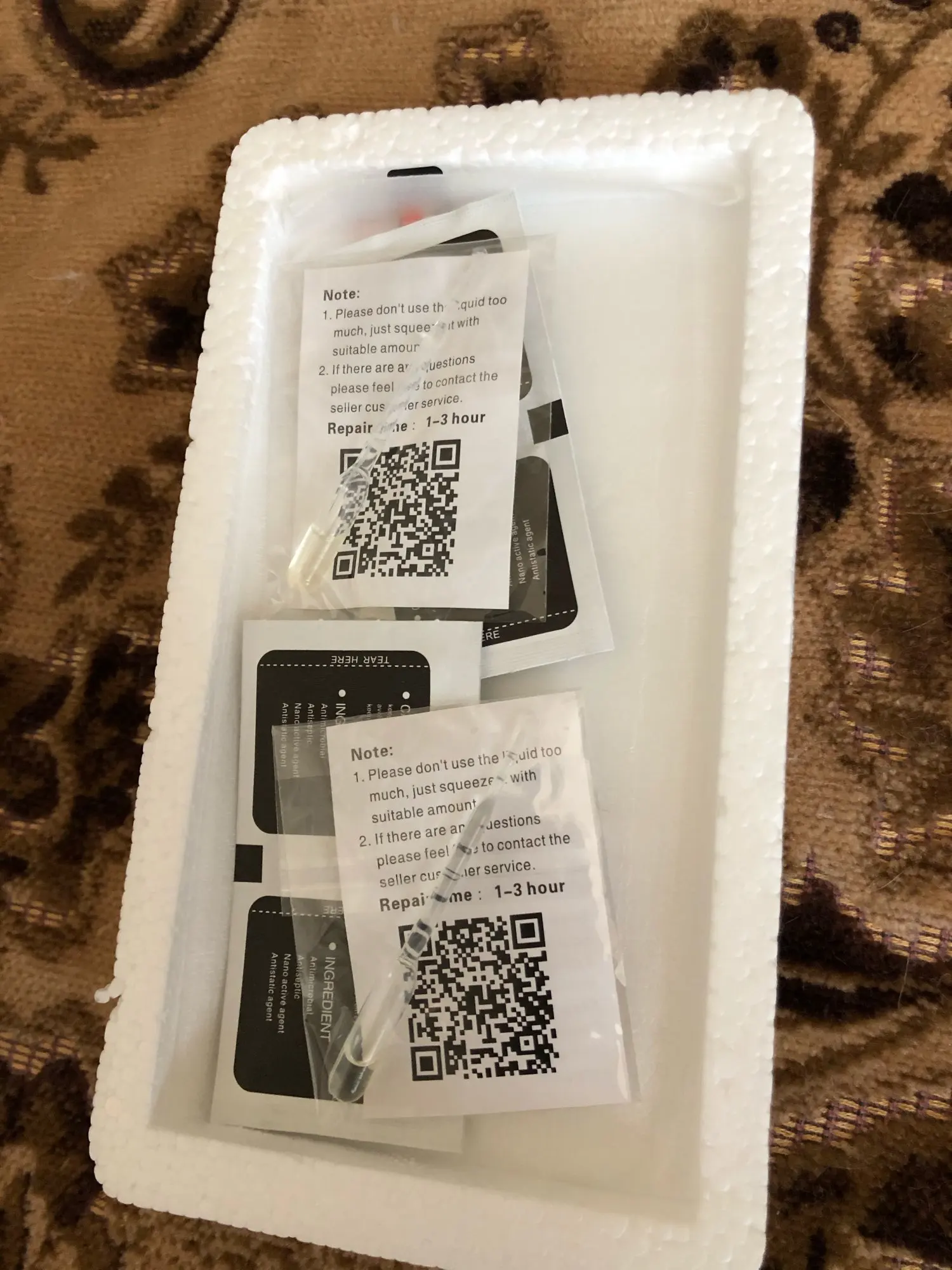 Klaas on üheosaline, pakitud vahtnõusse, seal on niisked salvrätikud (kuivad ja märjad), servade tihendamiseks on vedelik, see on väga soovitatav