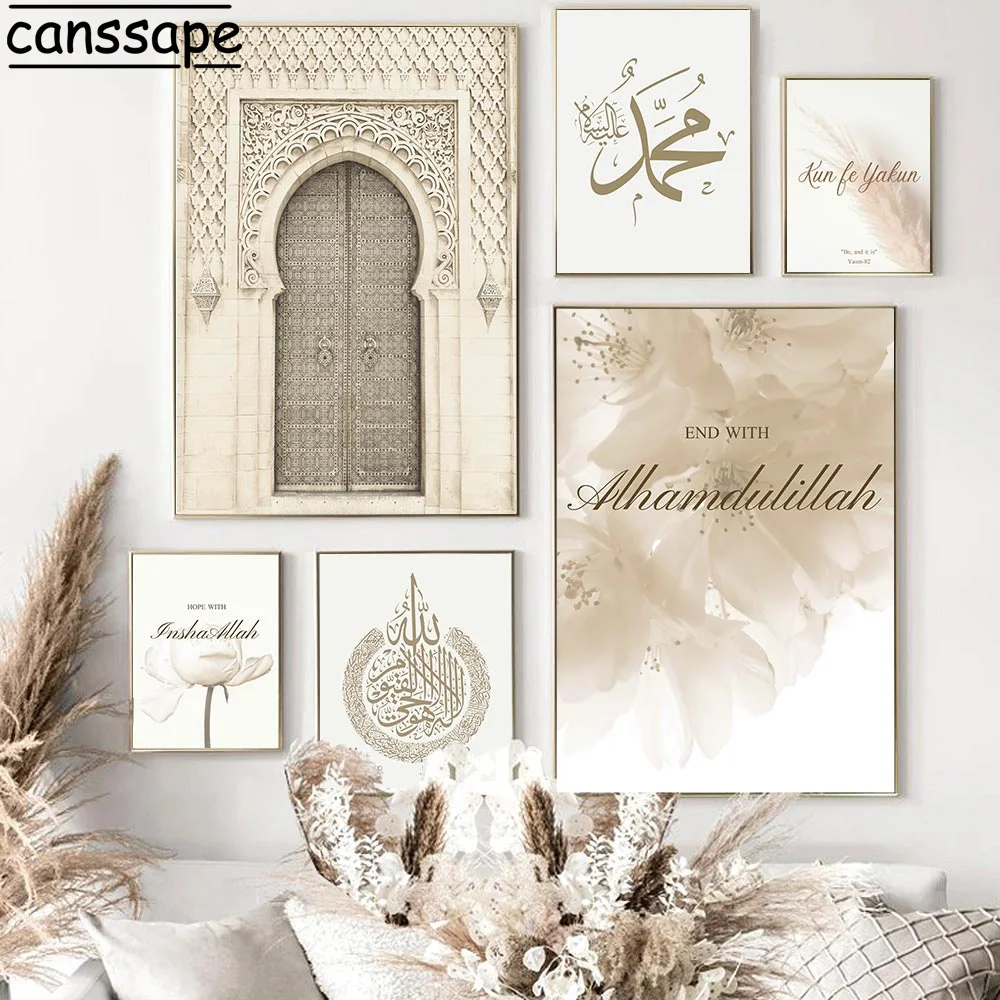Мусульманские настенные картины с принтом бисмиллы, постеры с изображением двери Марокко, рисунок на холсте с лотосом, бежевый настенный постер, декор для гостиной