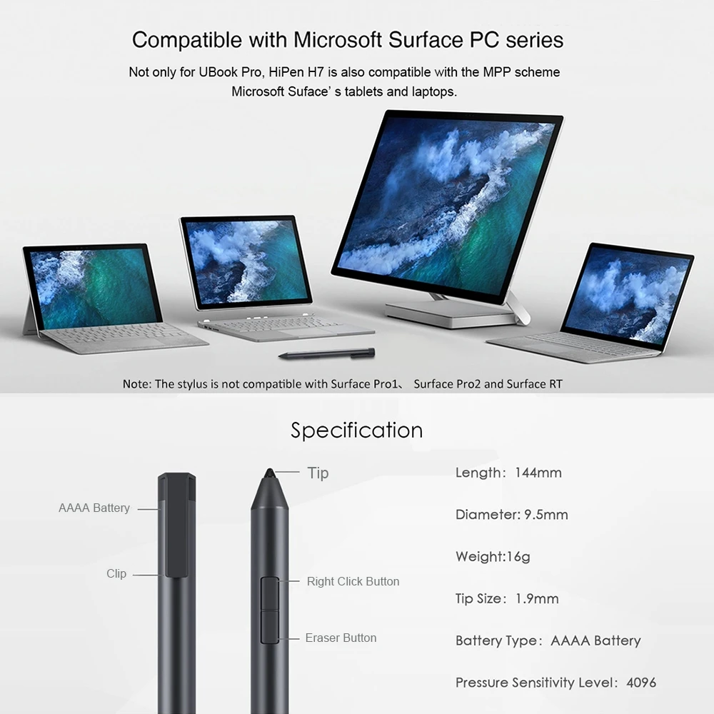 1. 4096 уровень давления чувствительность Стилус.2. Металлический матовый корпус ручки, эргономичный дизайн.3. Оснащен чипом sonsor с низкой задержкой: линии письма гладкие и естественные, более точные и произвольные, когда вы пишете.4. Кончик HiPen составляет всего 1,9 мм, который в такой обуви вы будете чувствовать себя более нежные и ровный почерк опыт, так же, как вы пишете использования настоящей ручки.5. Питание от аккумулятора AAAA, около 180 дней работы от аккумулятора.Примечание: штрих-код нового UBOOK / Hi10 X содержит "H6"