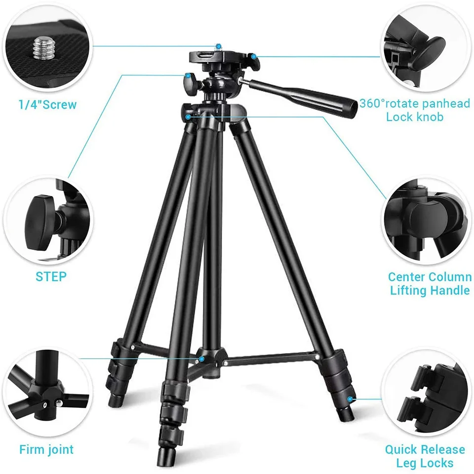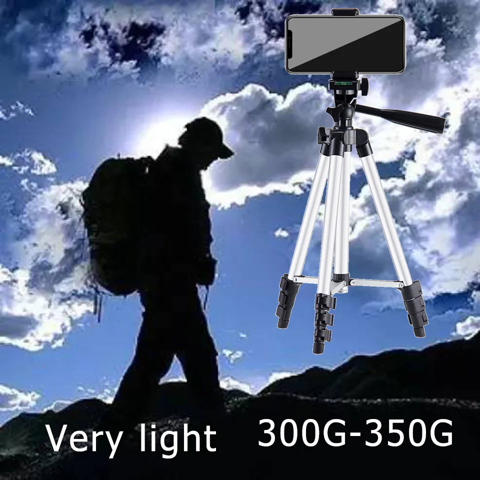 Moscow Warehouse Camera Phone Tripod Portable Stand For Ring Light Live Youtube Cellphone Video Gopro DSLR Mount Holder Clip1.Portable and flexible, ideal for outdoor, travel and timer shoots2.Built-in bubble level, making your tripod perfectly leveled3.Compatible with all Kinds of Digital Cameras, Camcorder or smart phon.4.360° horizontal and 90° vertical swivel to meet different needs5.With grip for adjusting head position6.Aluminum Legs with non-slip rubber feet, more safety.Tripod Specifications:Max Height: 102cmMin Height: 34cmFolded Length: 36cmMax. Tube diameter: 16.8mmPhone Holder Adjustable Width: 52-85mmThickness: Max.18mmMaximum Tripod Load:2.5kgScrew Size: 1/4’’Color: Silver,BlackMaterial: Aluminun Bluetooth Remote