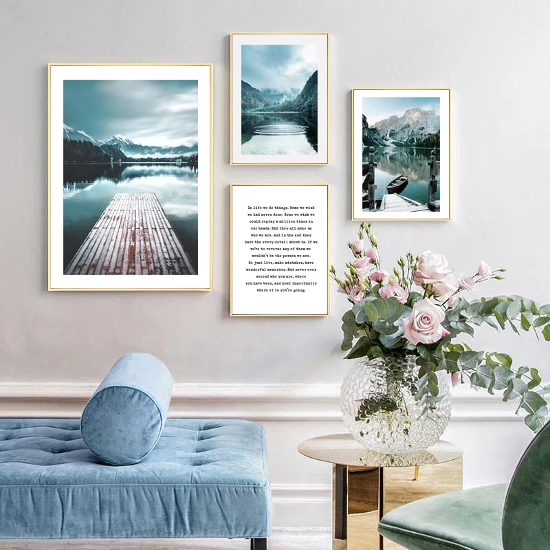 Пейзаж, живопись, озеро, снег, горы, холст, Постер в скандинавском стиле, Художественная печать, лес, причал, цитаты, настенное украшение, картина