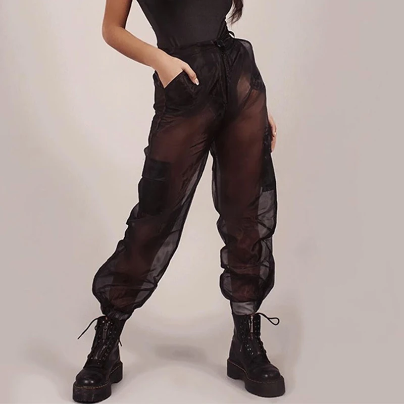 Черные Сетчатые прозрачные брюки-карго, женские летние повседневные свободные брюки с высокой талией, женские брюки в стиле Харадзюку с карманами, 2021