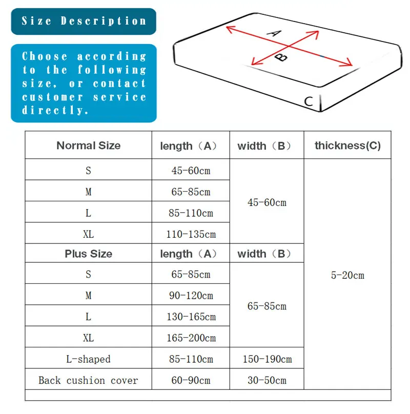 Подходящий размерный ряд:Обычный Размер 1(S) : длина 40-65 см ширина 45-60 см толщина 5-20 смОбычный Размер 2 (м): Длина 65-100 см ширина 45-60 см толщина 5-20 смОбычный Размер 3(L) : длина 100-140 см ширина 45-60 см толщина 5-20 смОбычный Размер 4(XL) : длина 140-180 см ширина 45-60 см толщина 5-20 см Плюс Размер 1(S) : Длина 65-95 см ширина 65-85 см толщина 5-20 смПлюс Размер 2 (м): длина 95-135 см ширина 65-85 см толщина 5-20 смПлюс Размер 3(L) : длина 135-165 см ширина 65-85 см толщина 5-20 смПлюс Размер 4(XL) : длина 165-200 см ширина 65-85 см толщина 5-20 смЗадняя крышка подушки: Длина 60-90 см ширина 30-50 см толщина 5-20 смL-образный: длина 150-190 см ширина 85-110 см толщина 5-20 смДорогие друзья, если у вас есть какие-либо вопросы по длине 60-90 см шириной 30-50 см толщиной 5-20 см, пожалуйста, свяжитесь с нами напрямую, мы порекомендуем вам наиболее подходящий размер. Счастливые покупки