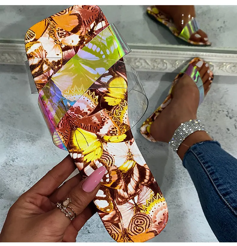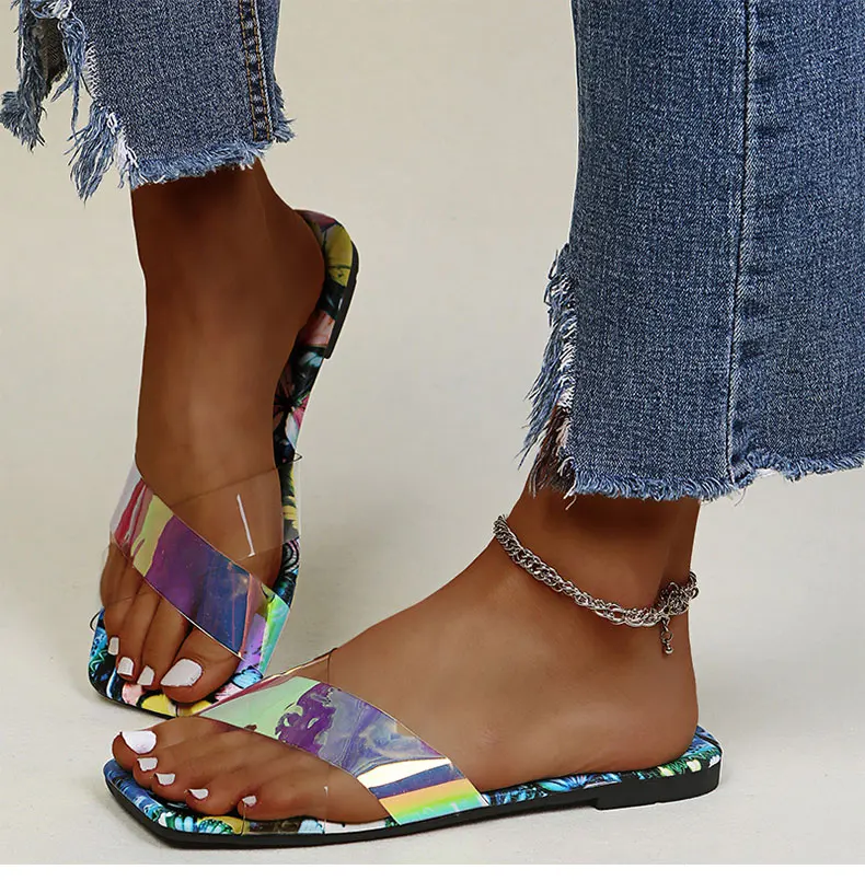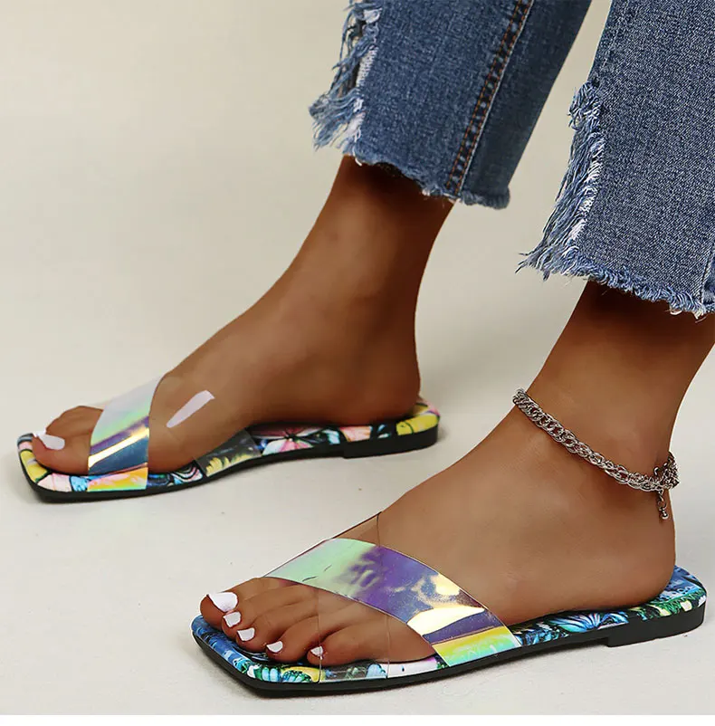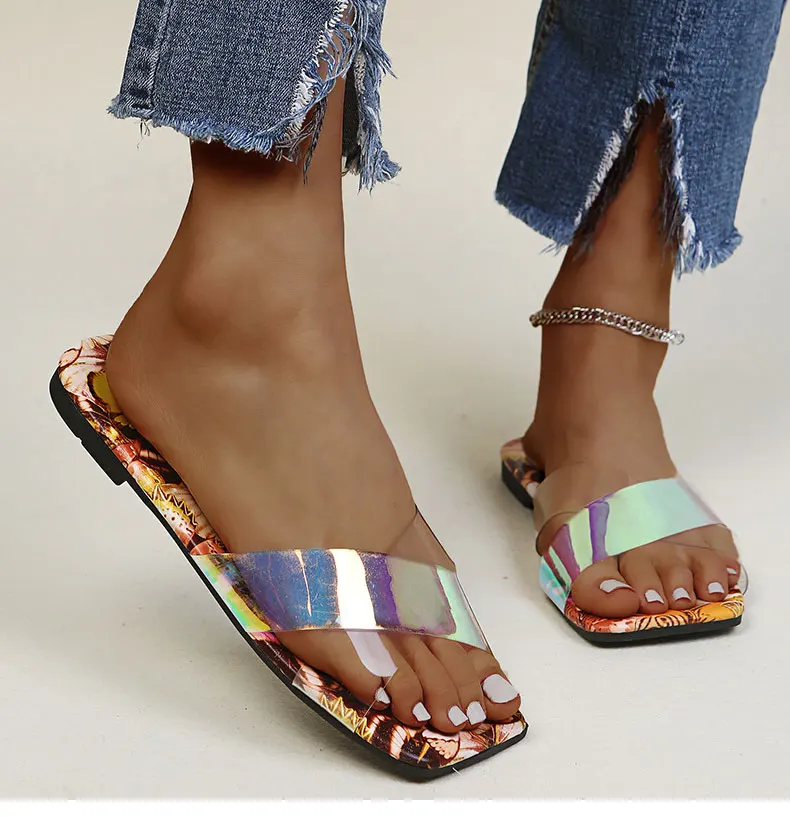 Женские босоножки; Летние Красочные плоские туфли; Женские прозрачные шлепанцы; Летние шлепанцы на плоской подошве размера плюс; Chaussure Femme; Модные вьетнамки