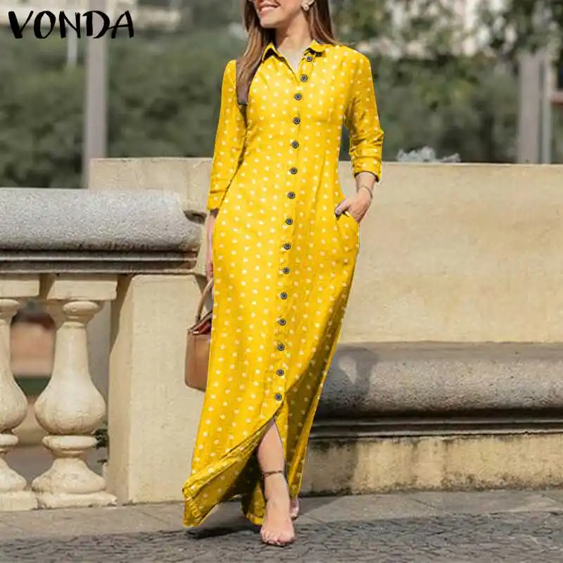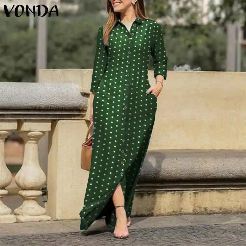 Длинное винтажное платье макси в горошек, плиссированные платья с длинным рукавом VONDA, женское Повседневное платье с отложным воротником и пуговицами, богемное платье
