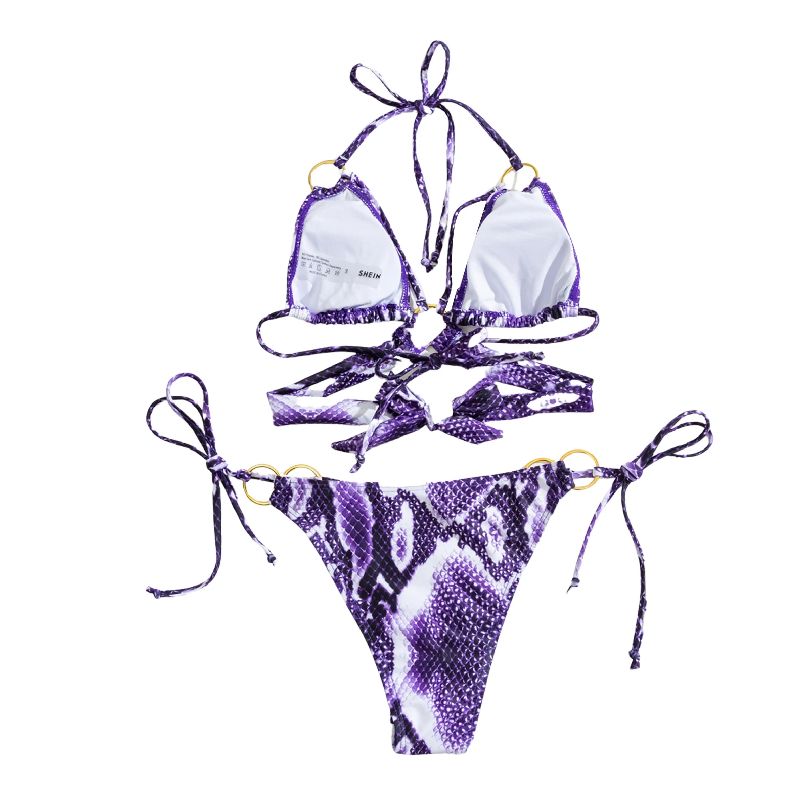 Женский летний раздельный купальник, комплект для взрослых и женщин с принтом змеиной кожи, привлекательный купальник бикини с открытой спиной и завязкой на шею