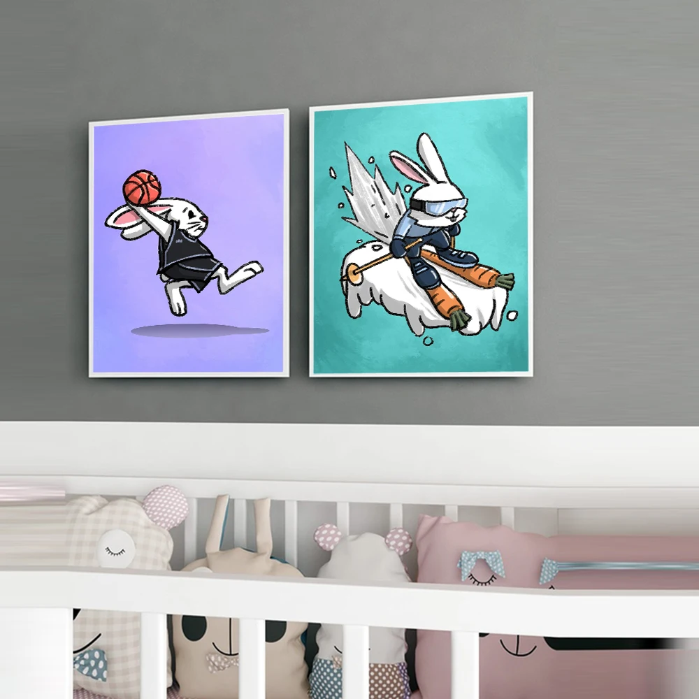 Забавный милый кролик, цветной постер, бейсбол, баскетбол, боулинг, катание на лыжах, заяц, Картина на холсте, мультфильм, детская комната, Настенный декор