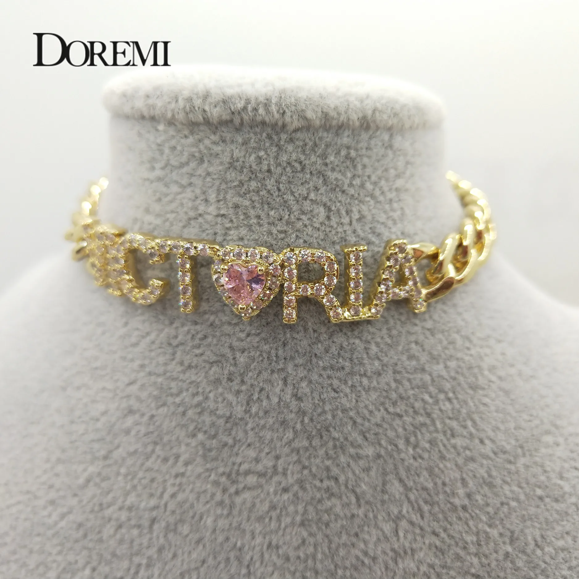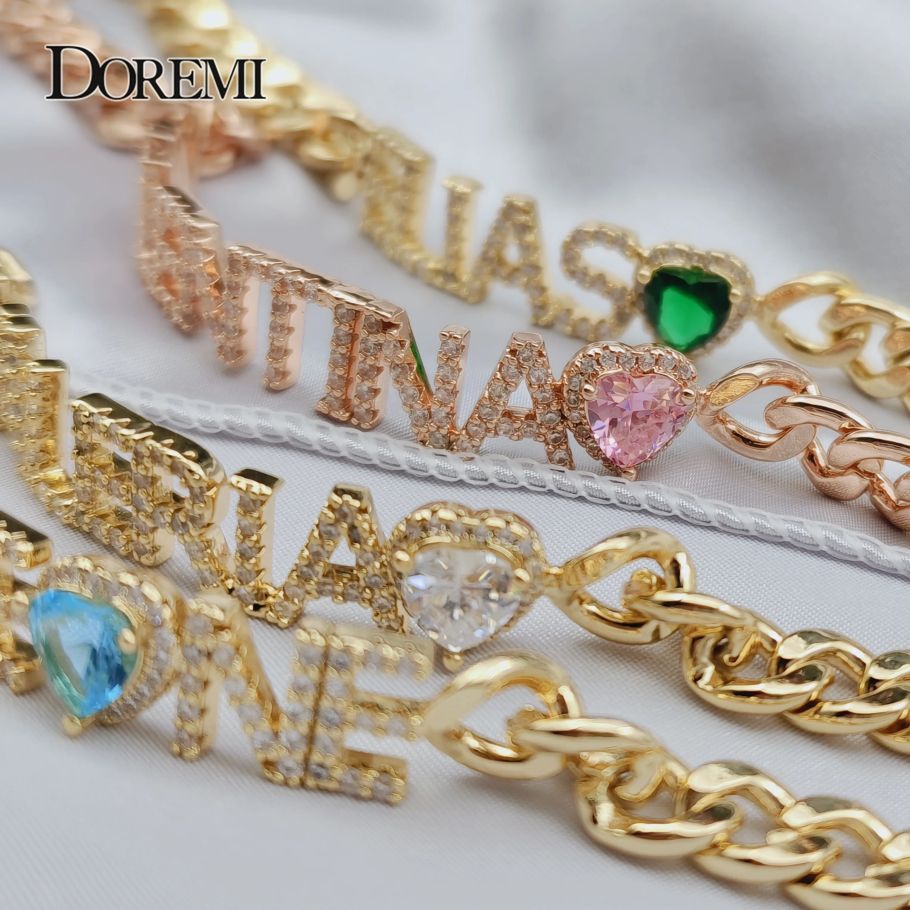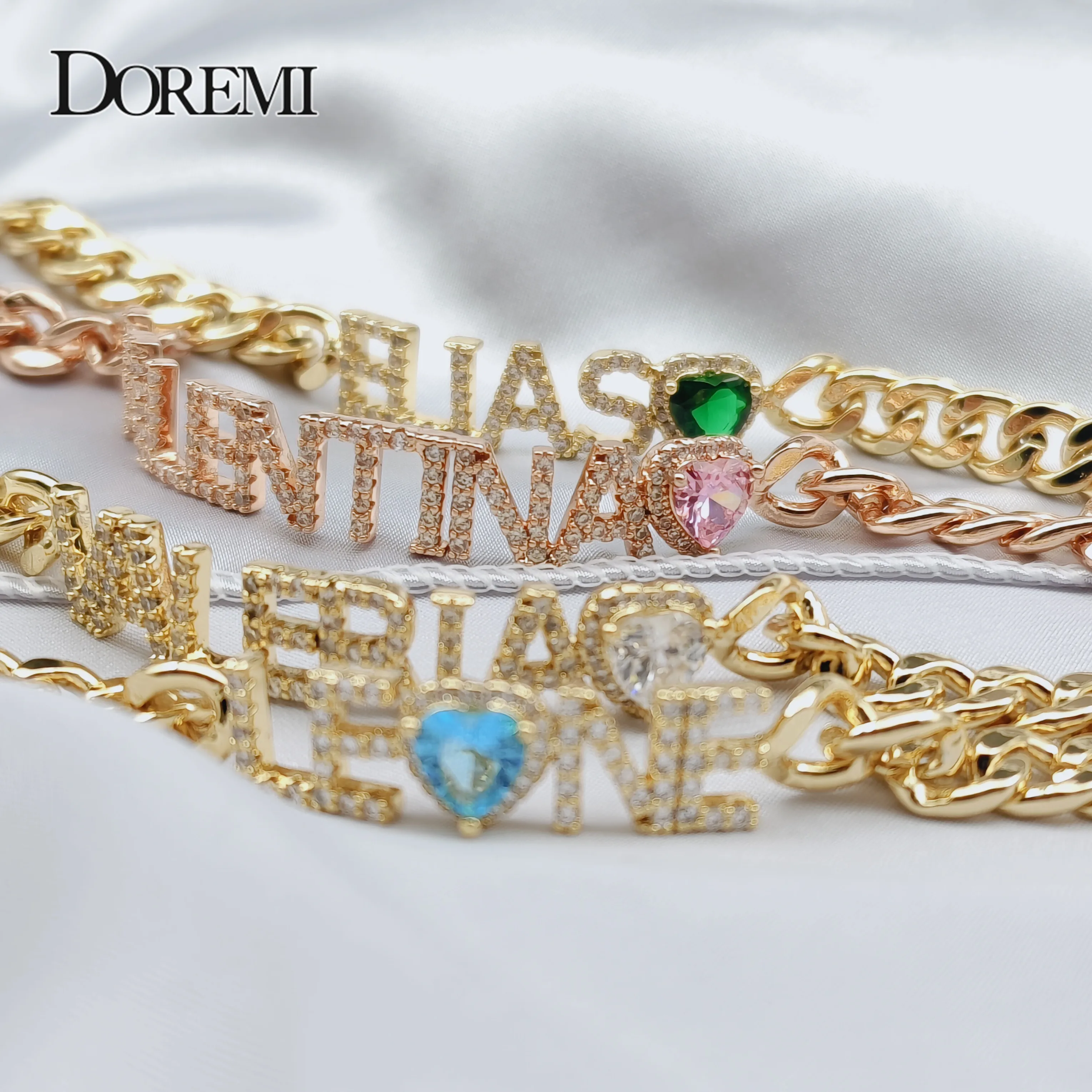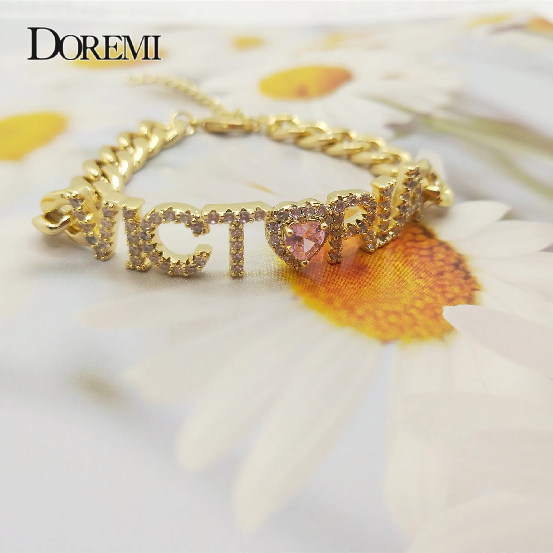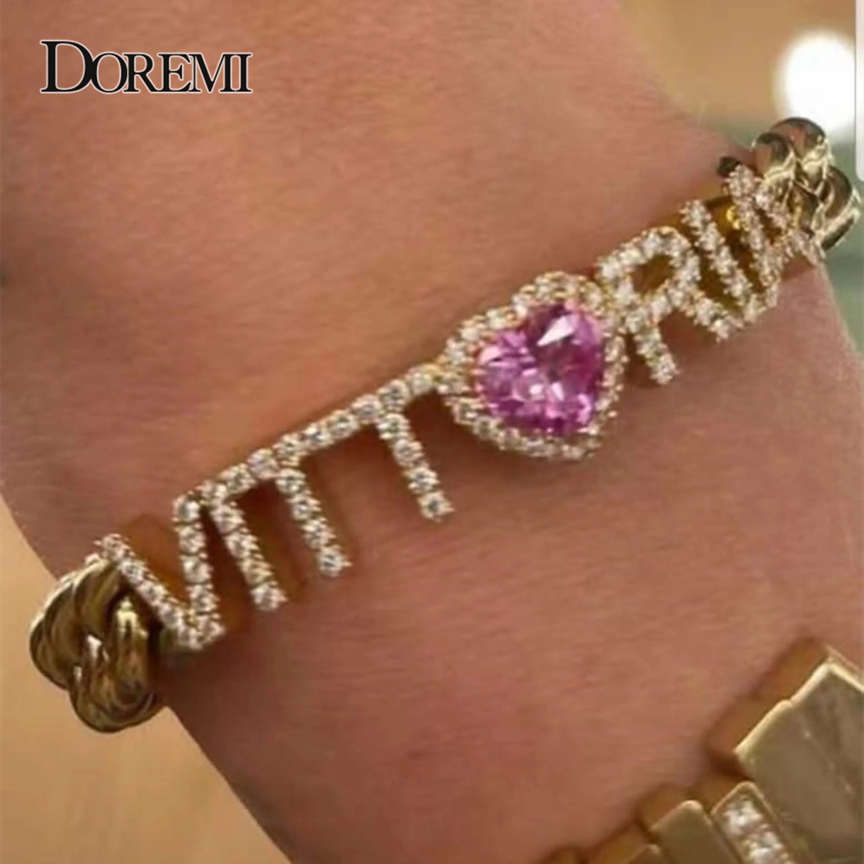 DOREMI розовые браслеты с фианитами в форме сердца с толстыми кубинскими звеньями, браслет с именем имени, циркониевый браслет-цепочка для женщин, подарок