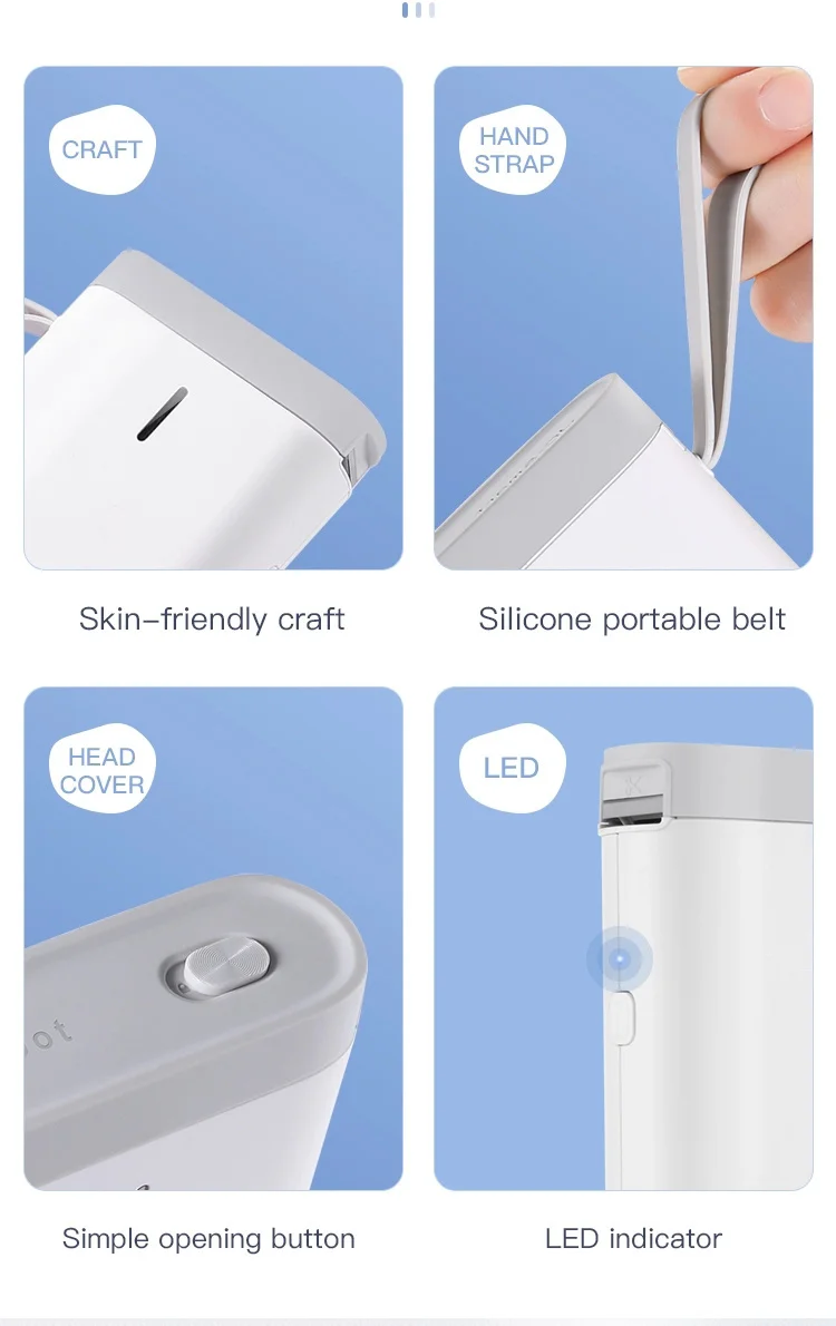 Беспроводной дизайн, поддерживает печать на большие расстояния. Беспроводное расстояние до 10 м. Прямой тепловой, без чернил, тонера или лент. Поддерживает все основные форматы этикеток: цена, дата, размер, вес, имя и т. д. Универсальный, простой в использовании. Компактный и легкий, удобный для переноски. Аккумулятор емкостью 1200 мАч поддерживает длительное использование.