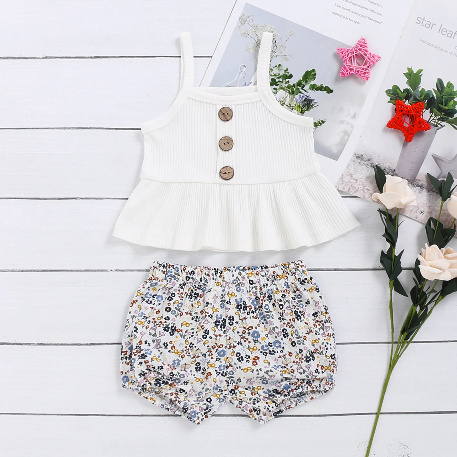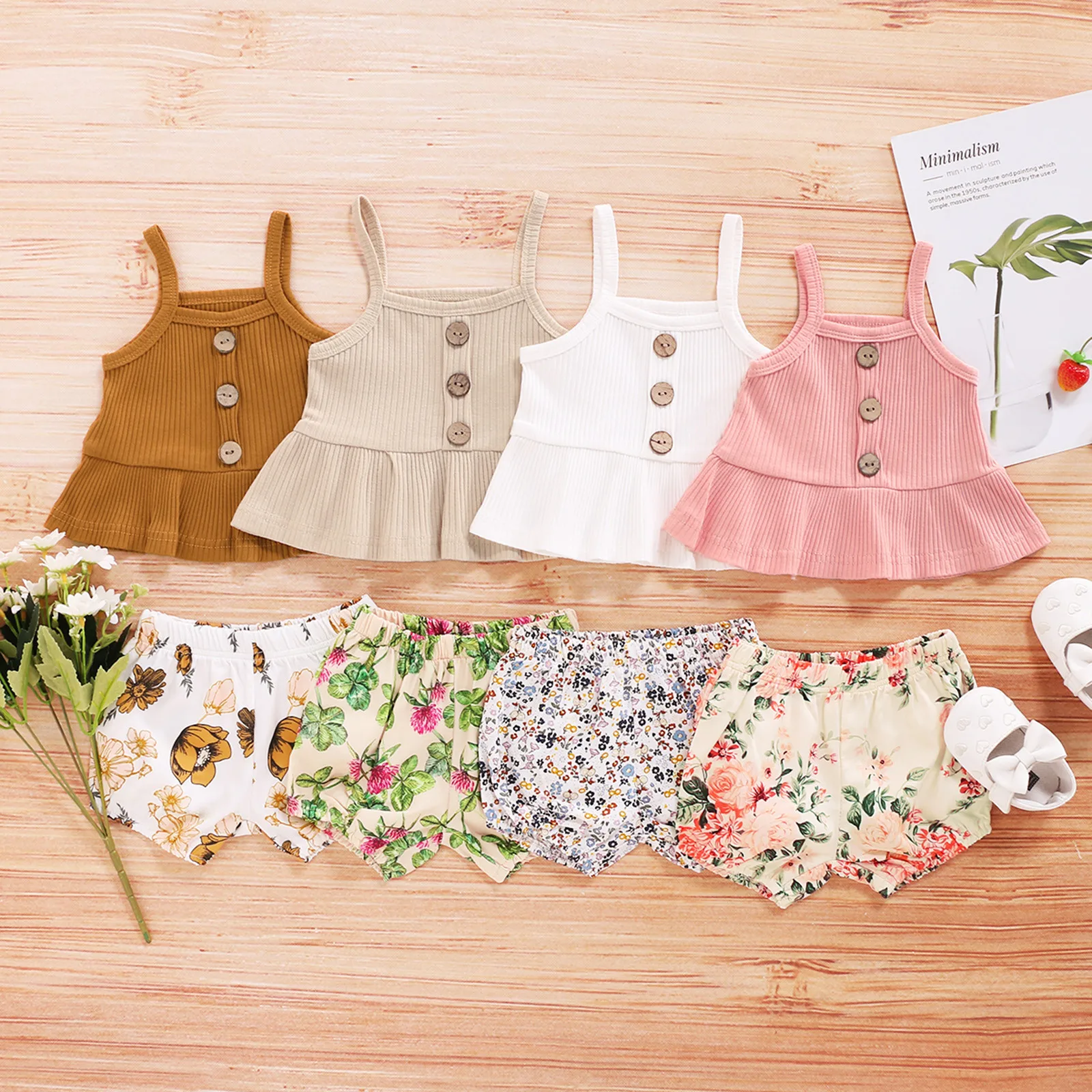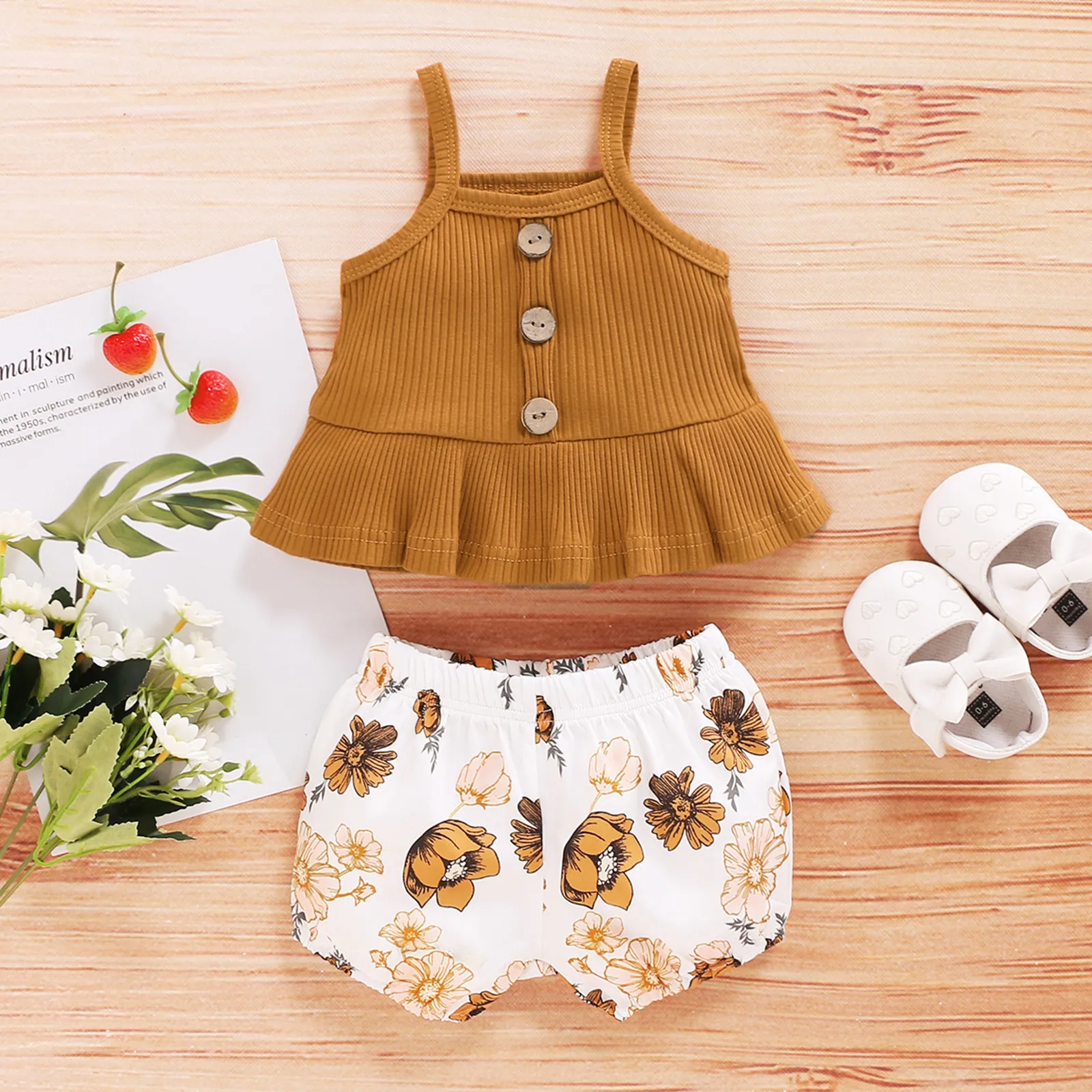 Одноцветные подтяжки с оборками для маленьких девочек; Топы; Шорты с цветочным рисунком