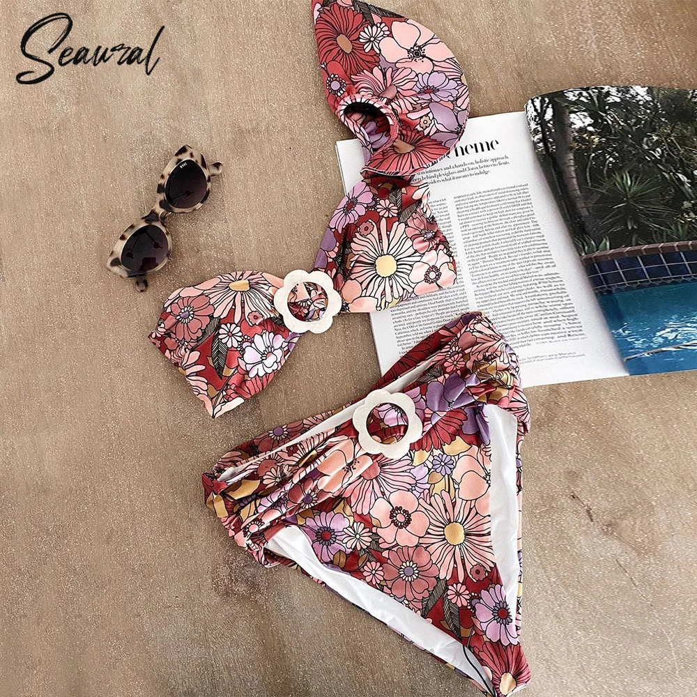 Пикантный комплект бикини с высокой талией и оборками, новинка 2021, купальник на одно плечо, женский купальный костюм с цветочным принтом, пляжная одежда, бикини