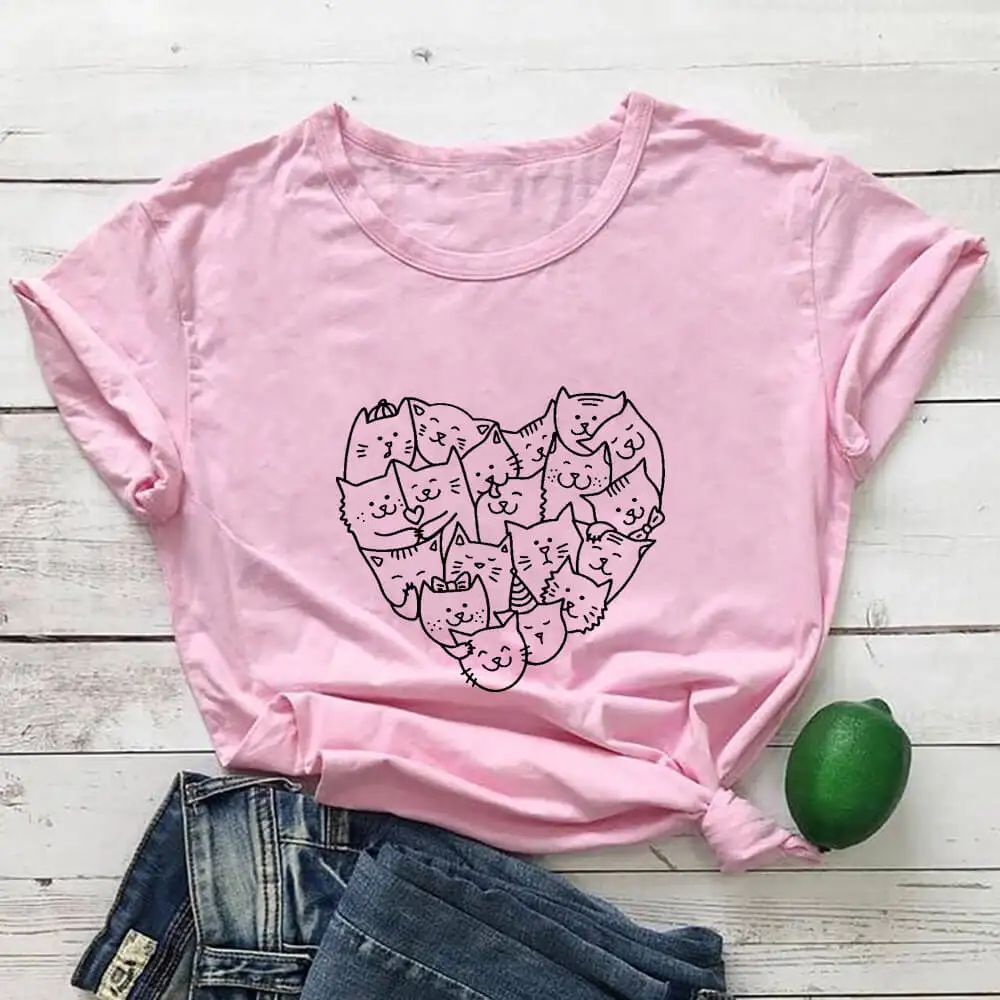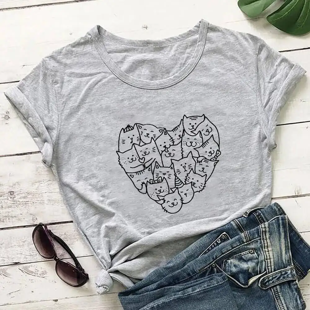 Кошек, принтом сердечки и милым без рукавов с принтом кошки, 100% хлопчатобумажная Женская футболка кошка Мама Жизнь забавная летняя повседневная одежда с О-образным вырезом, с коротким рукавом, лучший подарок для любителей животных