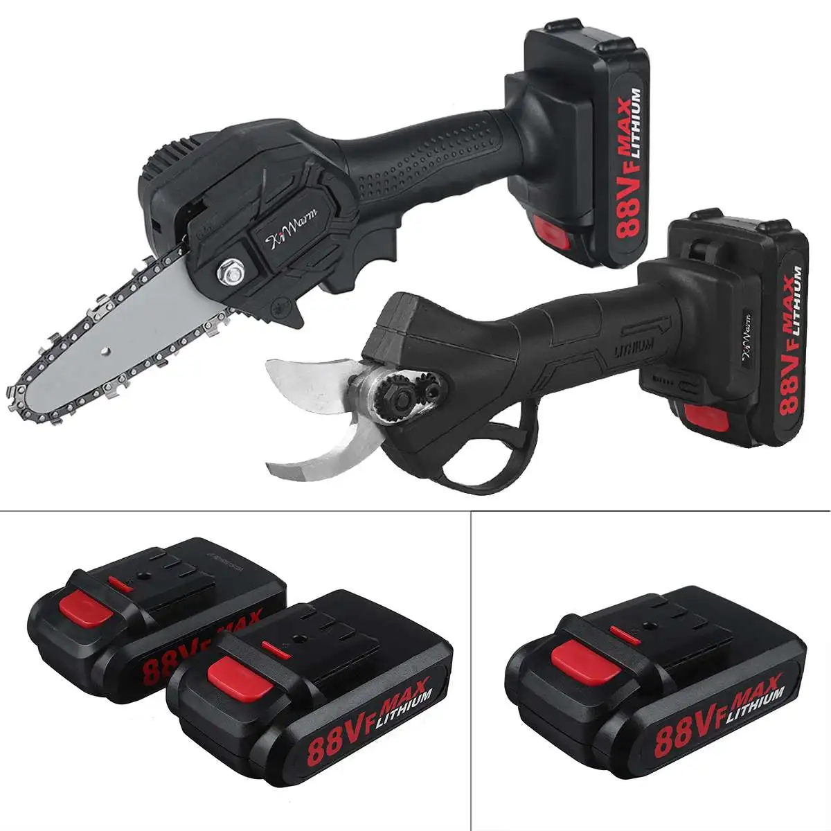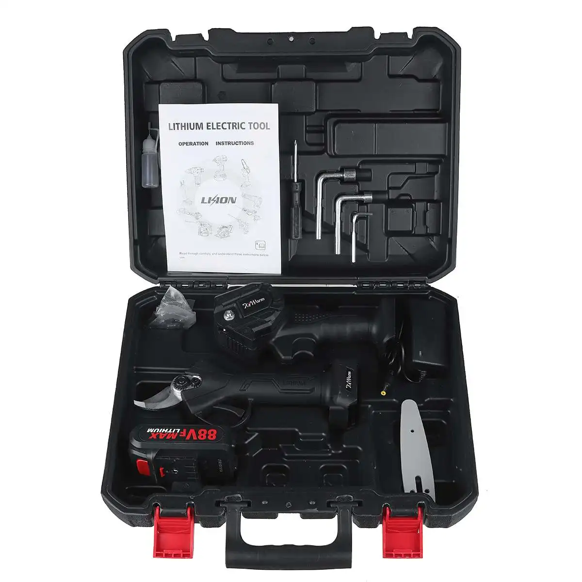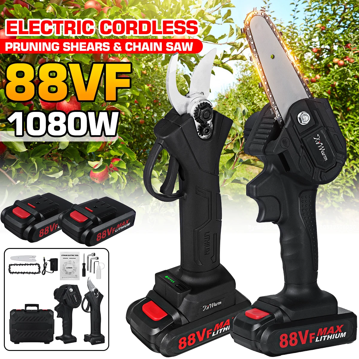 Упаковочный лист:1 Электрическая цепная пила1 x Ножницы для обрезки1/2 x батарея1 зарядное устройство (вилка стандарта ЕС/США)3 х гаечный ключ1 отвертка1 х Бутылка для смазочного масла2 x Руководство пользователя1 х пластиковая коробкаA:88VF электрическая Беспроводная цепная пилаСпецификация:-Материал: металлическая стальная цепь-Напряжение: 88VF-Цвет: черный-Мощность аккумулятора: 1080 Вт-Длина направляющей пластины: 4 дюймаОсобенности:-Практичная, быстрая скорость, низкое энергопотребление.-Двигатель из чистой меди, сильная мощность, быстрая резка, повышение эффективности.-Переключатель отличного качества, быстрая и медленная регулировка, плавное изменение скорости.-Высококачественная направляющая цепь, глубокая закалка, более износостойкая, гладкая резка.-Перезаряжаемая Электрическая цепная пила, светильник и портативный, длительный срок службы батареи, без повреждений коры.-Светильник вес тела, светильник и удобный, светильник вес конструкции, долгое время хранения и не устают руки.-Интеллектуальная плата управления цепью, защита от перегрузки, для удовлетворения ваших различных потребностей в конструкции.-Управление одной рукой: маленький размер, можно держать одной рукой.B:88VF электрические беспроводные секаторные ножницыСпецификация:-Напряжение: 88VF-Цвет: черный-Основные Материалы: ПВХ + металл-Пиковая мощность: 500 Вт-Макс. Резка: 30 ммОсобенности:-Ergonimic и удобная ручка.-Низкий уровень шума, хорошая устойчивость к усталости.-Лезвие, изготовлено из вольфрамовой стали, долговечное.-Перезаряжаемая литиевая батарея большой емкости для беспроводного использования.-Качество обрезки может соответствовать требованиям садоводства.-Аккумуляторные аккумуляторные секаторные ножницы для резки и обрезки ветвей в фруктовых садах, виноградниках.-Гибкий в использовании, легко поворачивается, безопасен и надежен, прост в обслуживании, удобен в замене батареи и эксплуатации.Примечание:1. Допускается погрешность в 1-3 см из-за ручного измерения. Перед размещением заказа, пожалуйста, внимательно ознакомитесь со всеми условиями.2. Цвета могут отличаться, так как на дисплее разница, пожалуйста, поймите.