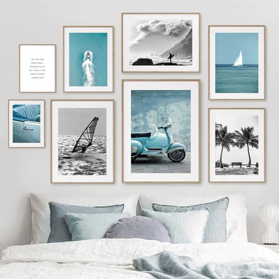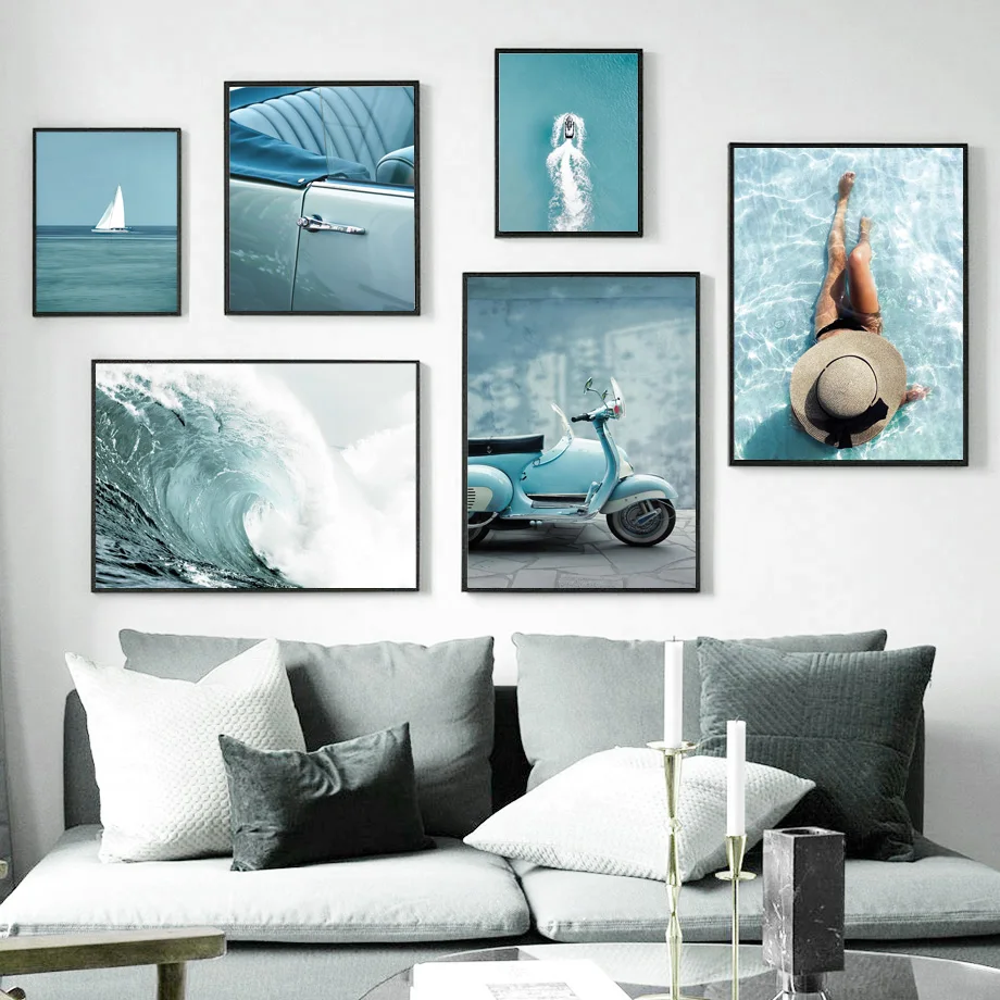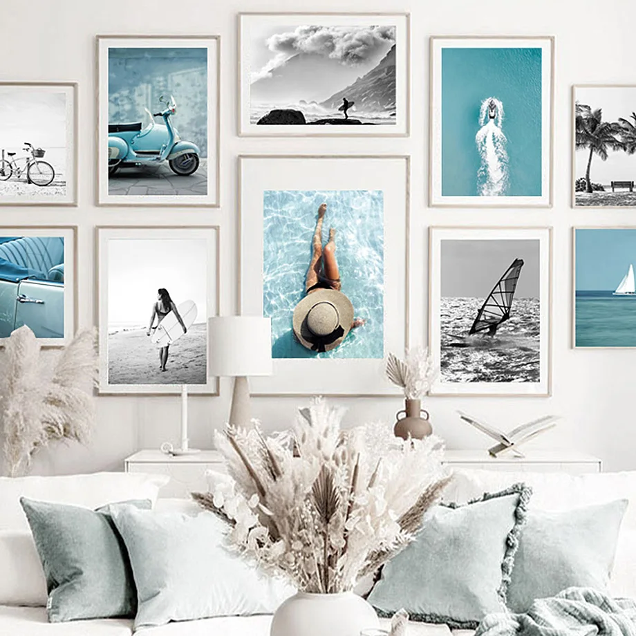 Пляж мото велосипед автомобиль море женщина серфинг стены искусства холст живопись плакаты и принты украшения гостиной скандинавском стиле винтажный Декор