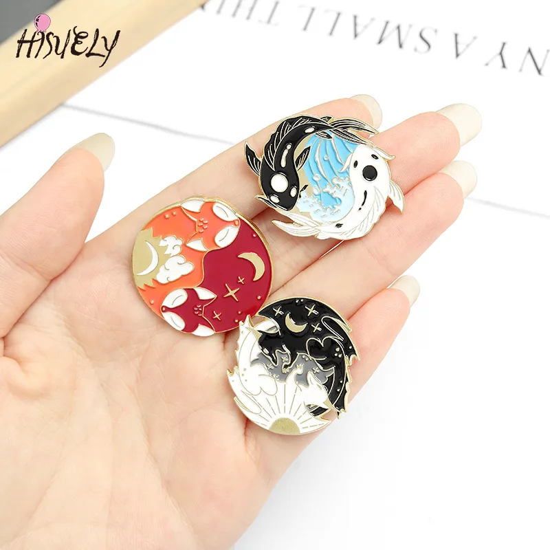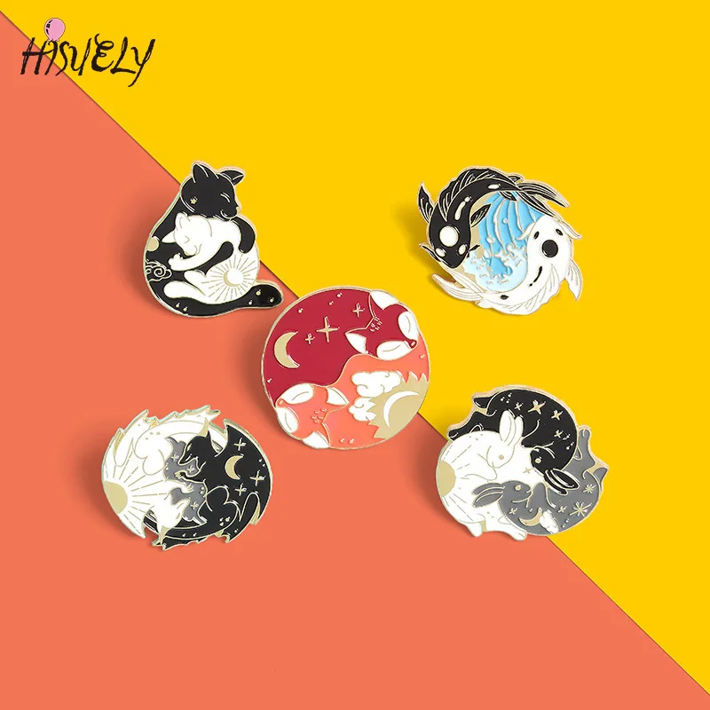 Эмалированная заколка с изображением солнца, луны, лисы, кои, кроли...