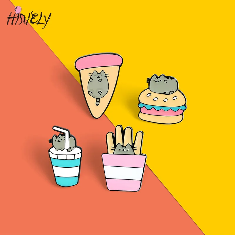 Креативный Черный кот картофель фри Черный кот брошь в виде пиццы черный значок с изображением кота быстрого питания шпилька с подвеской «Кот» милый мультфильм бургер напиток брошь
