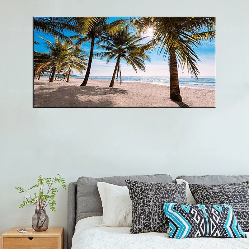 Морской пейзаж, постерт, холст, искусство на стене, солнце, лето, синий океан, волны, кокосовые деревья на песке, Пляжная живопись, море, природа, картины, украшение для дома