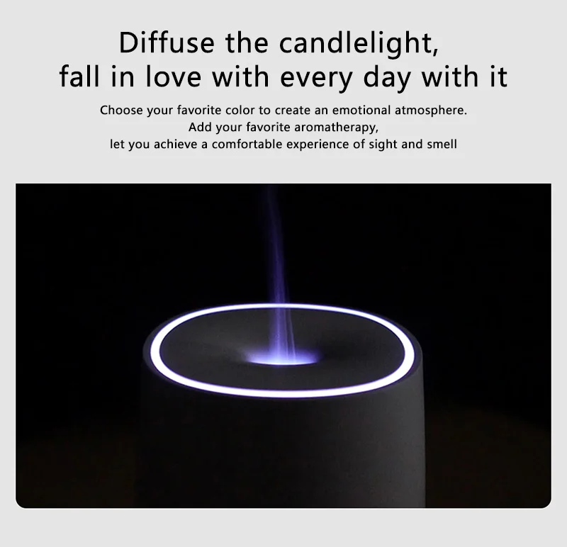 В темноте светильник сияет на тумане, как свечный светильник, красивый и элегантный.Включите свет одним нажатием кнопки, выберите семь цветов,Выберите любимый цвет и романтическую атмосферу.Добавьте нужное количество аромата, идеальное сочетание зрения и запаха для приятного ощущения.