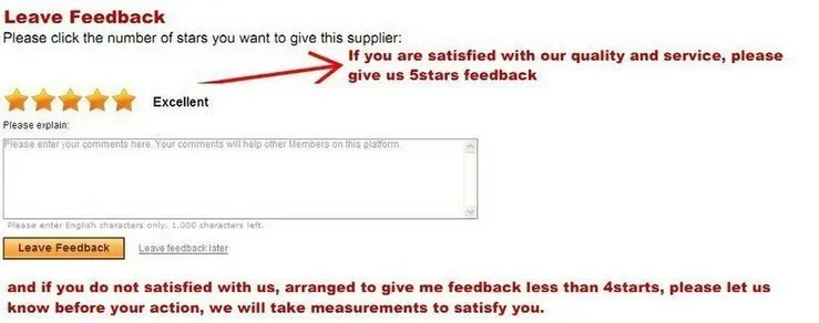 Удовлетворение ваших запросов и положительная обратная связь очень важны для нас. Пожалуйста, оставьте положительные отзывы и 5 звезд, если вы удовлетворены нашими товарами и услугами. Если вы остались недовольны качеством товара и обслуживания, не торопитесь подтверждать получение товара и писать негативный отзыв. Сначала свяжитесь с нами. Мы сделаем все возможное, чтобы решить любые проблемы и предоставить Вам лучшее обслуживание клиентов.