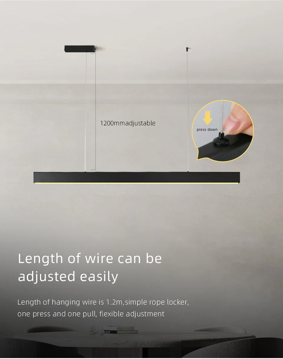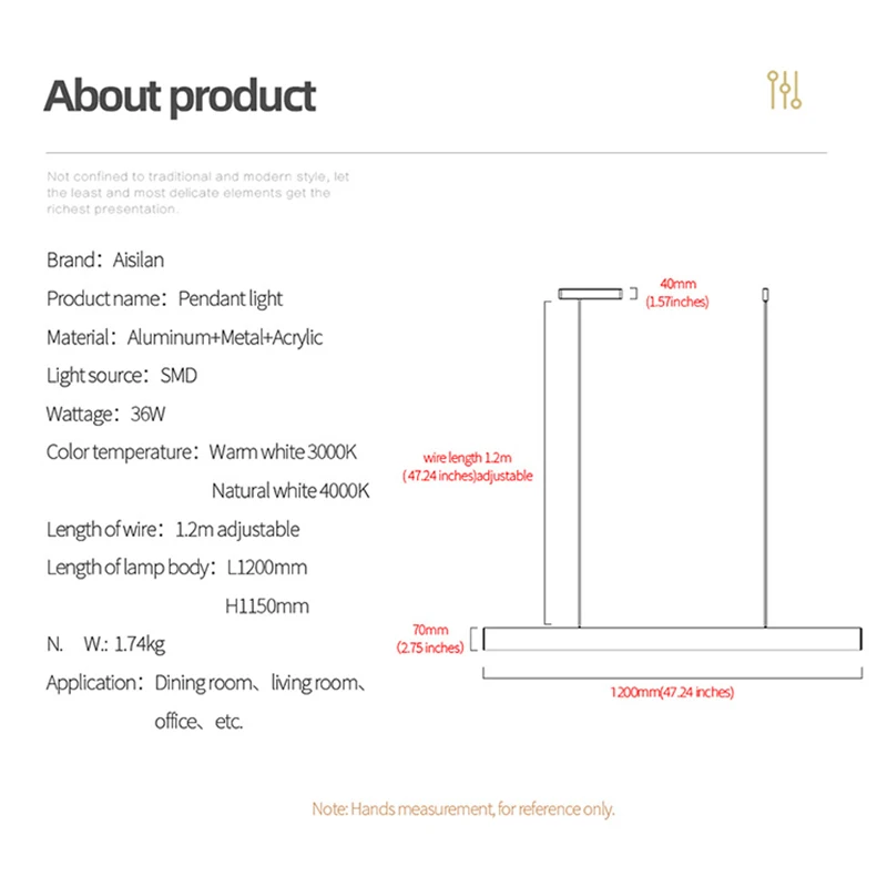 1200 мм (47,24 дюйма) 40 мм (1,57 дюйма) 70 мм (2,75 дюйма) 1,2 м: длина провода 1,2 м (47,24 дюйма) РегулируемаяБренд: AisilanНазвание продукта: подвесной светильникМатериал: алюминий + металл + акрилИсточник светильник: SMDМощность: 36 ВтЦветовая температура: теплый белый 3000K/натуральный белый 4000KДлина провода: 1,2 м, регулируемаяДлина корпуса лампы: д1200 мм в1150 ммВес нетто: 1,74 кгПрименение: столовая, гостиная, офис и т. д.
