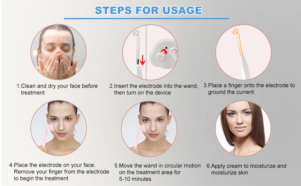 Как работает высокочастотное лечение кожи?Высокочастотная обработка может включать размещение электрода непосредственно на коже (прямая высокая частота) или оставление зазора между электродом и кожей (Непрямая высокая частота).Прямая Высокая частота: поможет вам обработать жирную кожу природы. Прямой метод подходит для жирной натуральной кожи.Непрямая Высокая частота: помогает вам обработать естественную кожу и состаренную кожу. Подходит для сухой натуральной кожи и состаренной кожи.Примечание: рекомендуется лечение: рекомендуется Непрямая высокая частота.Метод сверкания: подходит для ран, боли и воспаления. Это нормальное явление, если при прикосновении трубок к коже появляются блестки.Трубки сверкают красный светильник при использовании.Метод ухода за волосами: подходит для стимуляции поверхности кожи, уменьшающей фолликулит.Эффект использования отличается, потому что используются различные конструкции кожи для всех.