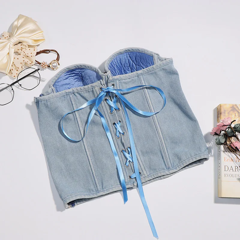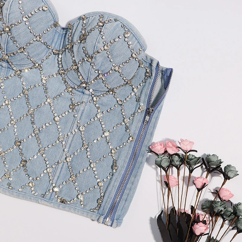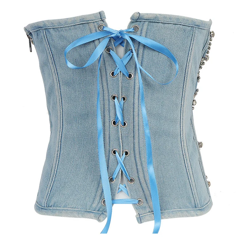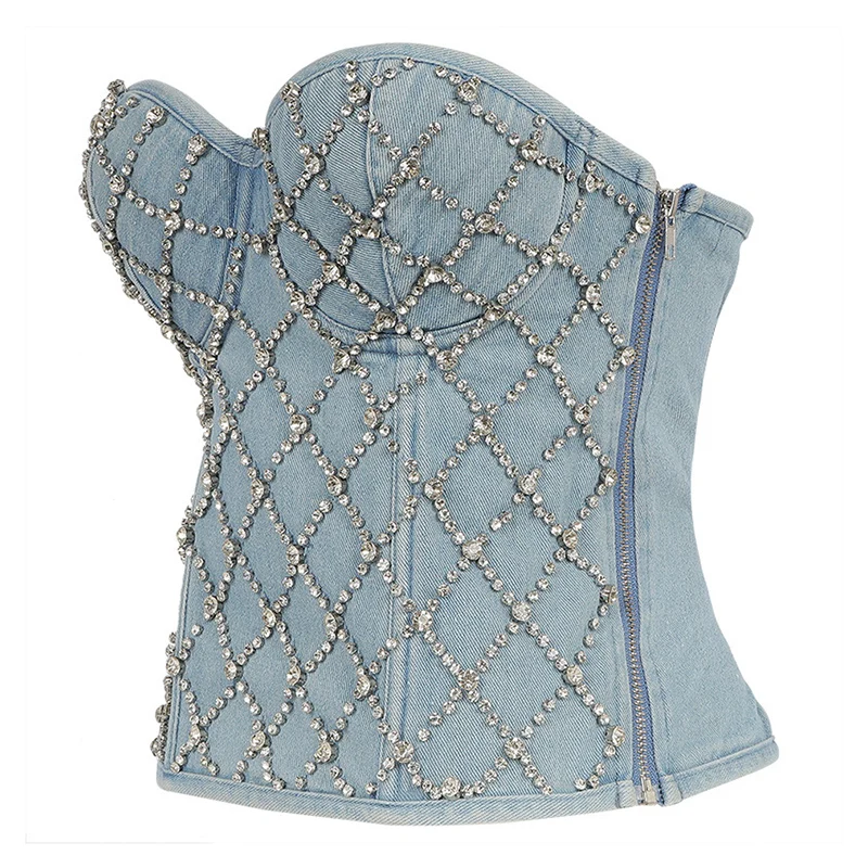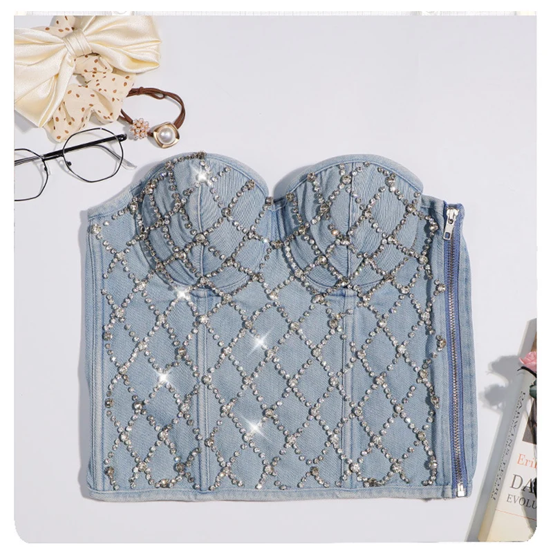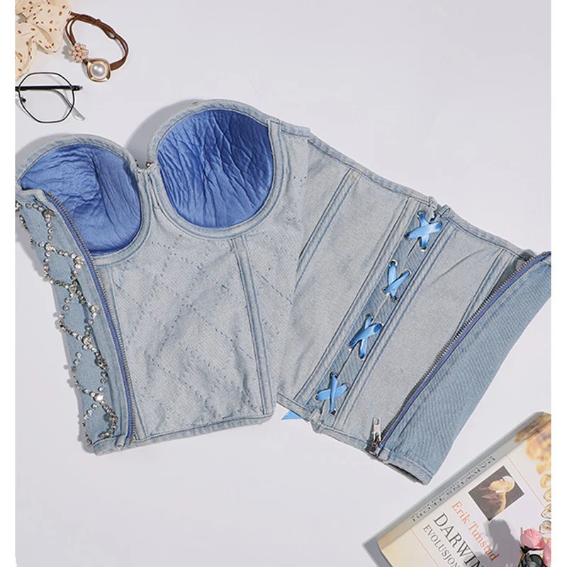 Женские Стразы, Джинсовый корсет, топ, бандаж, длинный бюстье, бюстгальтер на молнии, без бретелек, со стразами, синий топ на бретелях, праздничная одежда