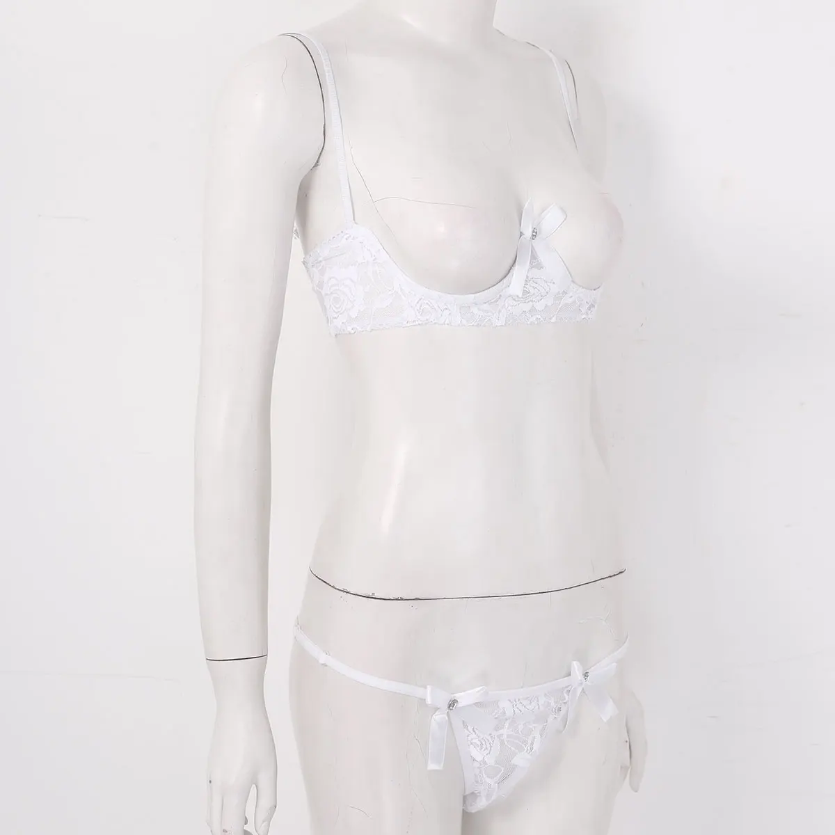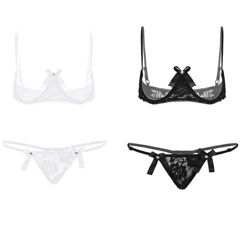 Особенности: Комплект женского эротического кружевного белья из 2 предметов, хорошая эластичная и легкая ткань, мягкая и удобная в носке. Бюстгальтер на косточках с открытой грудью и бантом в центре, без подкладки, с полукруглой чашечкой для хорошей поддержки, эластичные регулируемые бретели и застежка на крючок для лучшей посадки. Трусы-стринги с заниженной посадкой и регулируемой талией, украшенные двумя бантами-лентами спереди. Уникальный дизайн подчеркивает ваши края и изгибы, делает вас более привлекательной и очаровательной. Идеально подходит для особых ночей, Дня Святого Валентина, медового месяца, элегантный внешний вид сделает вас более привлекательной для вашего партнера. Пожалуйста, внимательно проверьте размер перед покупкой, рекомендуется ручная стирка.