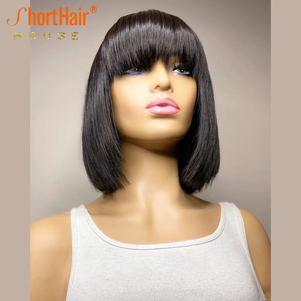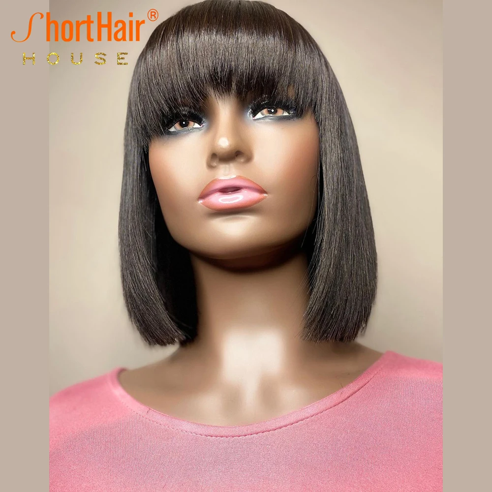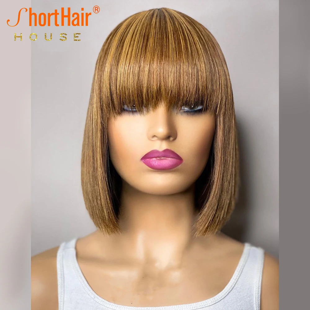 Парик из человеческих волос золотисто-коричневого цвета, блестящий короткий, с полной челкой, бразильский парик для женщин, машинное изготовление