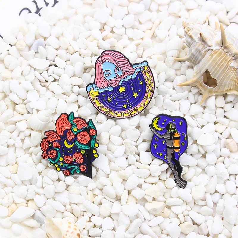 Брошь Звездная ночь голубая ночь луна звезды астронавт дайвер красивая девушка эмалированная заколка космические приключения значок искусственный подарок