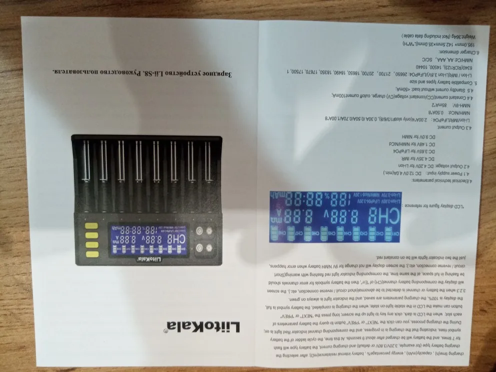 Зарядка отличная и не плохая доставка в Казахстан. 32 дней. Инструкция на русском языке. Но ставлю 3 баллов за очень плохую упаковку. Приложил фото коробки. Как будто стадо слонов по ней пробежало. Удивлен что само устройство не пострадало. Убедительная просьба продавцу хорошо упаковывать товар. Зарядка удобна для зарядки большого количества аккумуляторов.