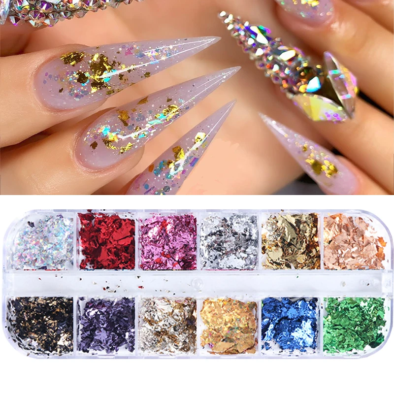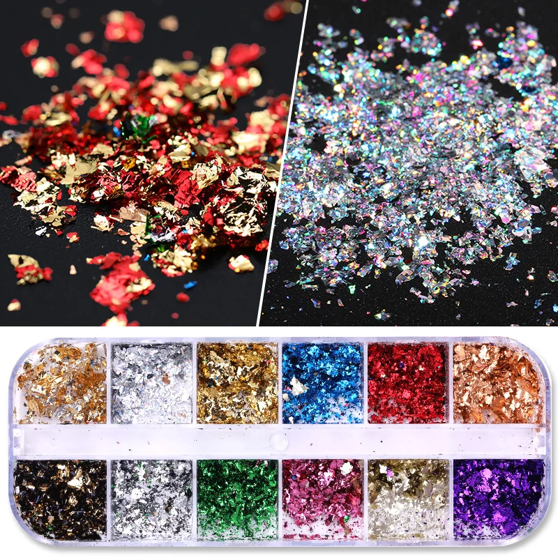 12 сетка золотой фольги великолепные ногти блеск нерегулярные Алюминий хлопья блестка Чип к требованиям заказчика; Сверкающие; Металлический блеск для ногтей, Типсы для маникюра