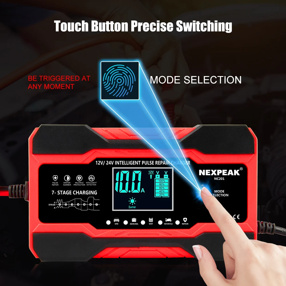 1. Поддержка зарядки 12V-24V свинцово-кислотные аккумуляторы для мотоциклов2. Сенсорная кнопка3. Поддержка AGM/гелевых батарей.Поддержка импульсных ремонтных батарей