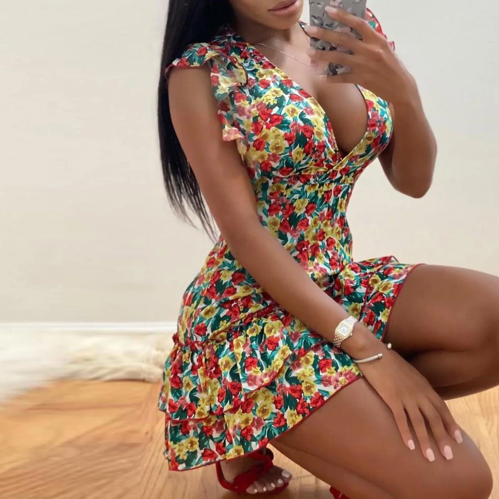 Женское сексуальное нижнее белье с глубоким v-образным вырезом платья летние женские туфли с оборками на рукавах, Цветочный принт мини платье пикантная женская обувь размера плюс облегающее вечерние платье халат t