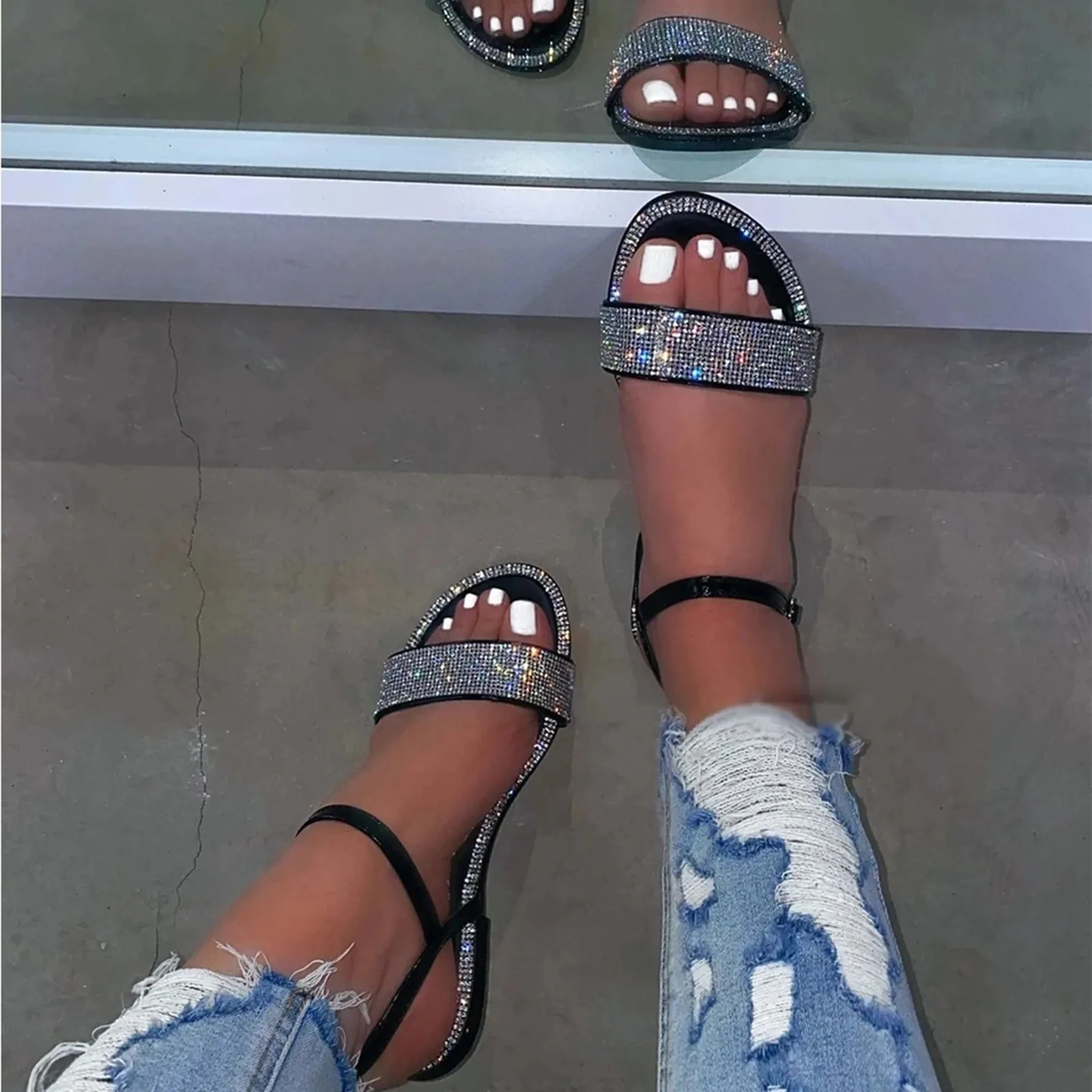Сандалии женские с круглым носком, Уличная Повседневная обувь на плоской подошве, пляжные босоножки с ремешком и кристаллами, роскошная обувь, лето
